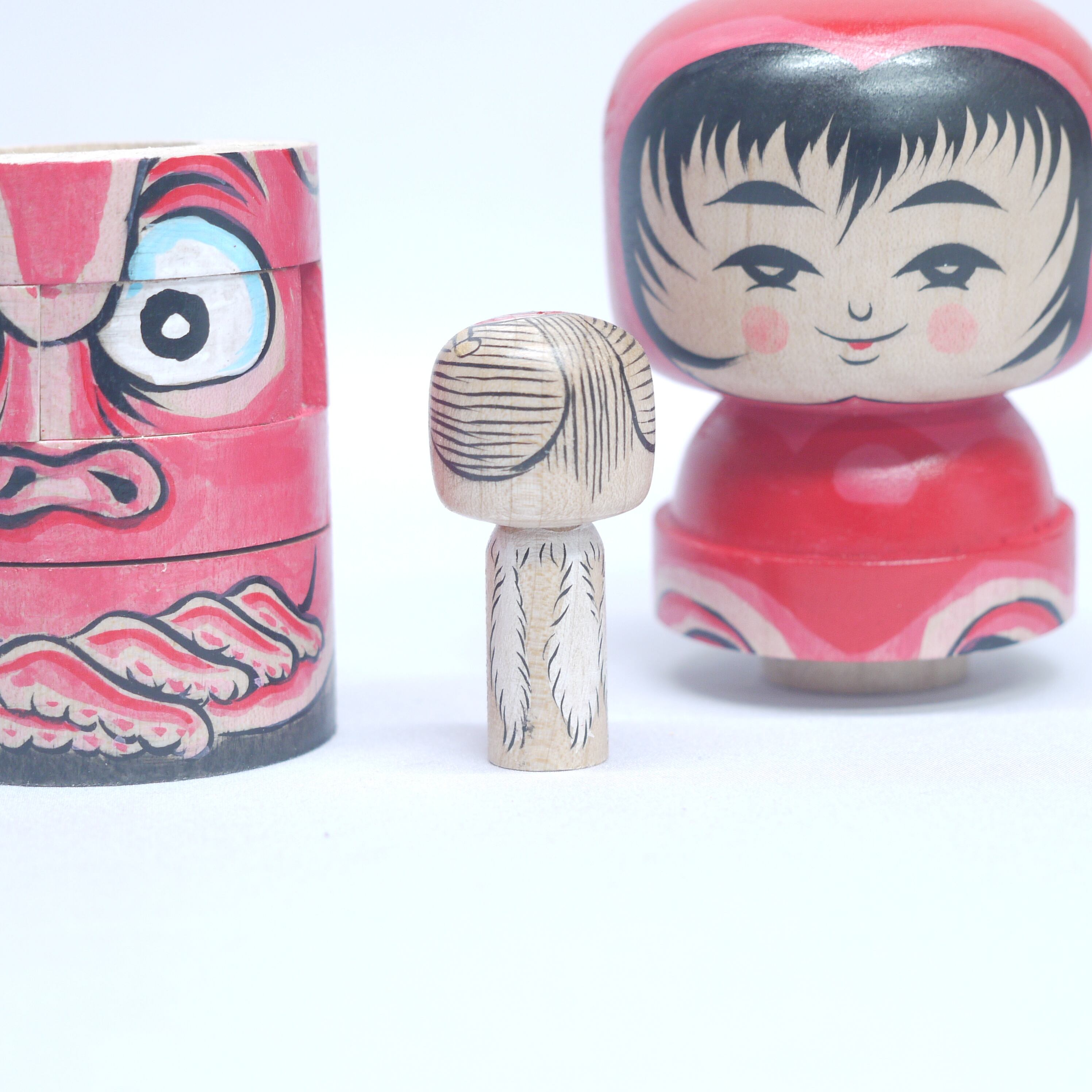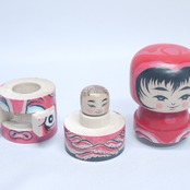 既存の入子(いりこ)との違いは胴部分が観音開きの窓になっており、この窓を開けて中のこけしの顔を見ることができる点です。