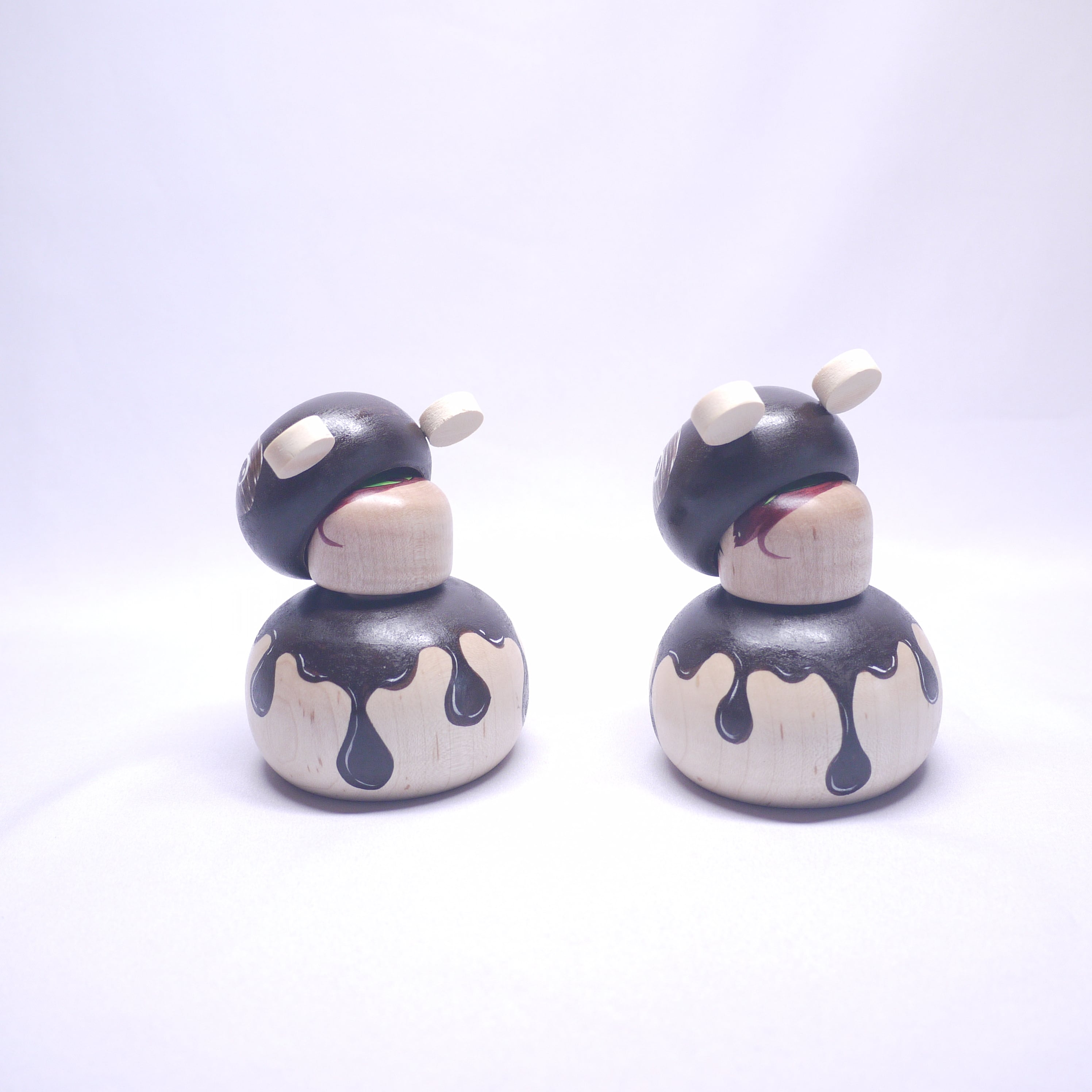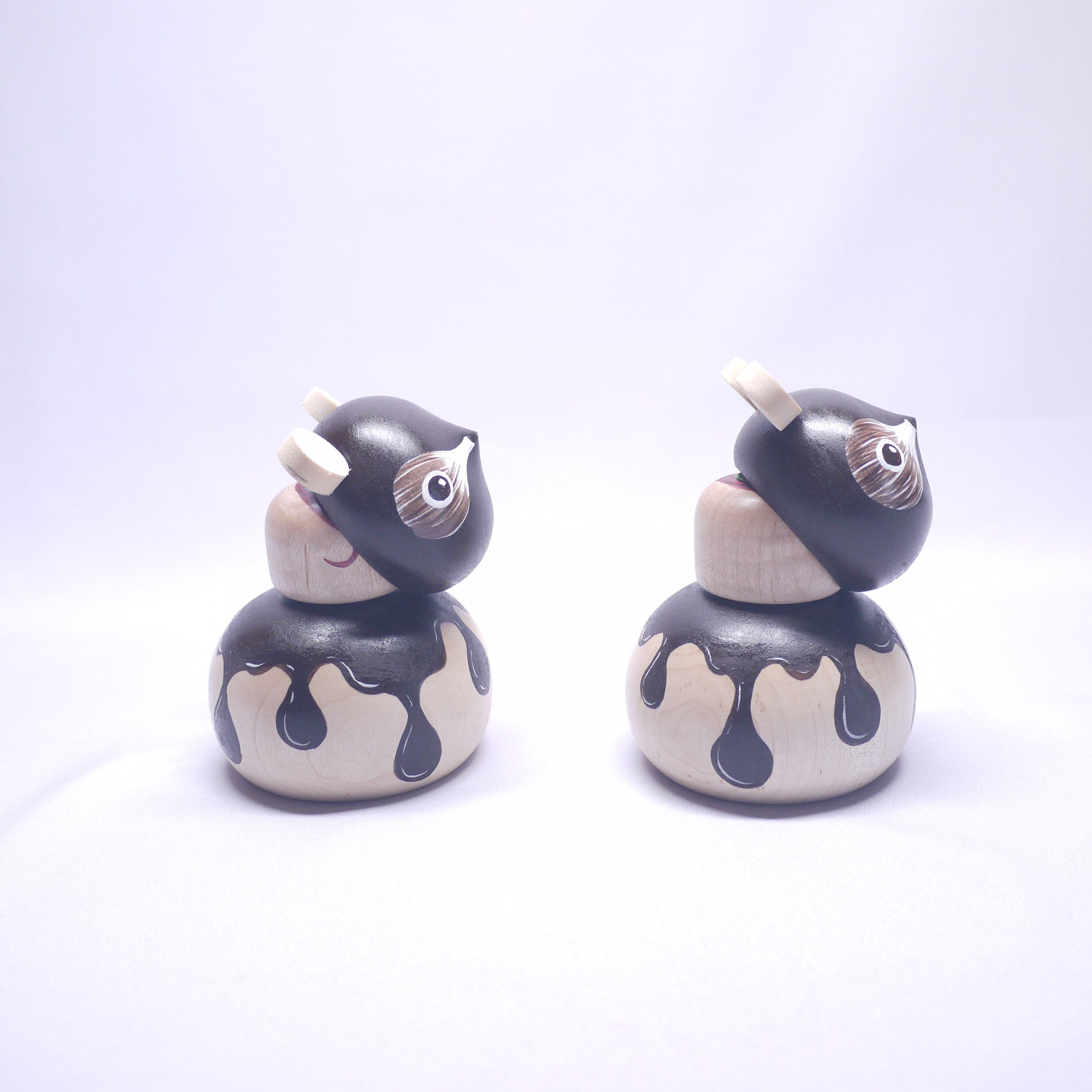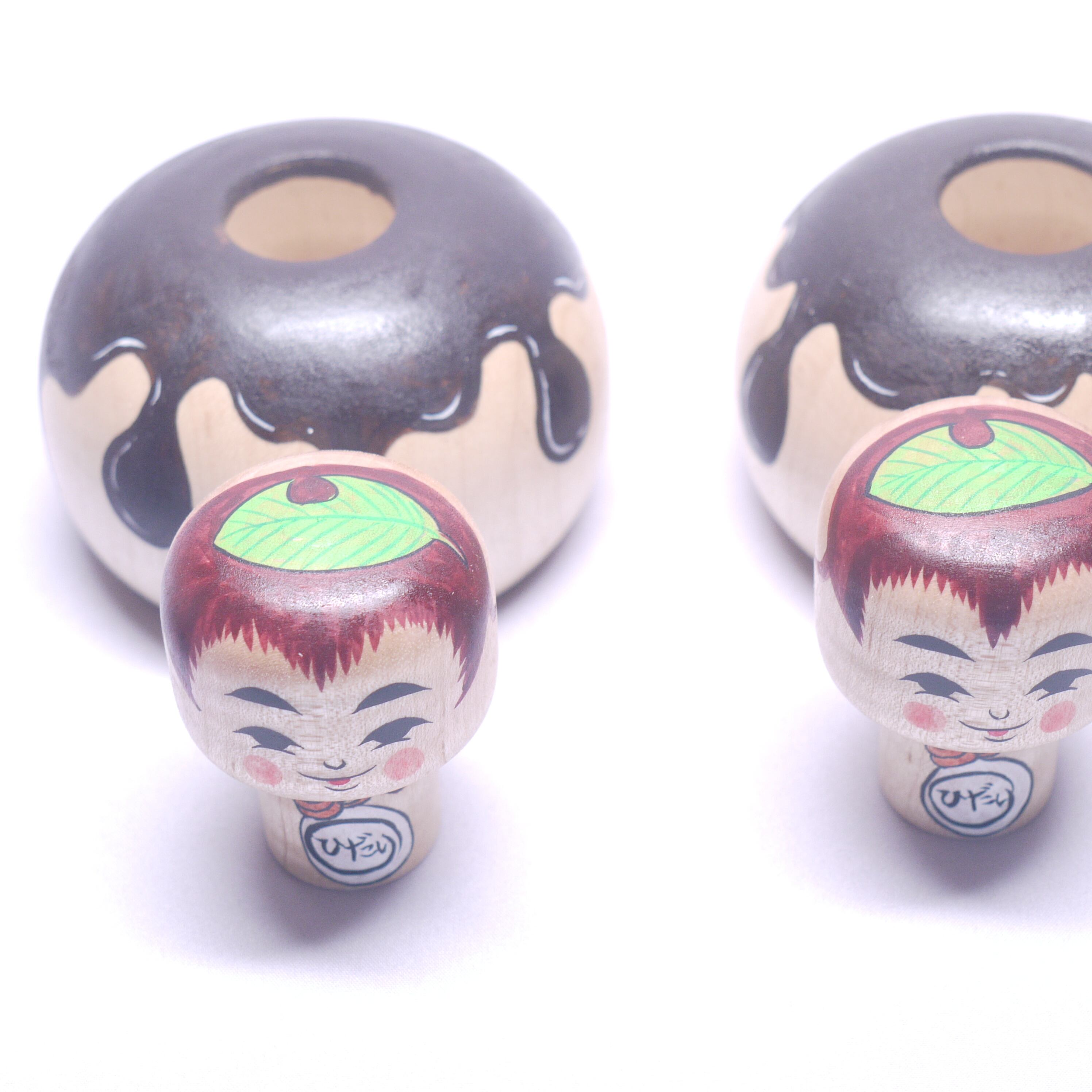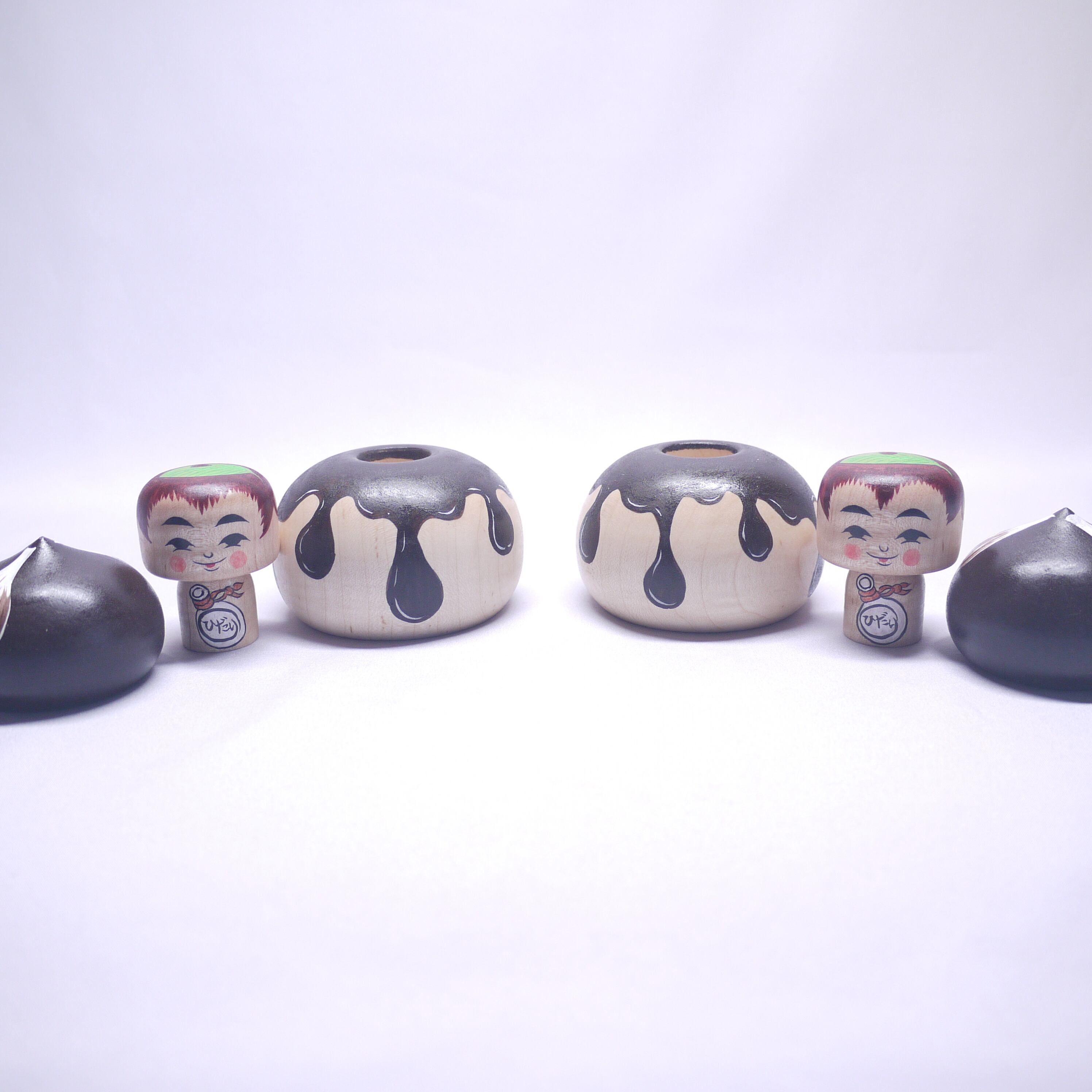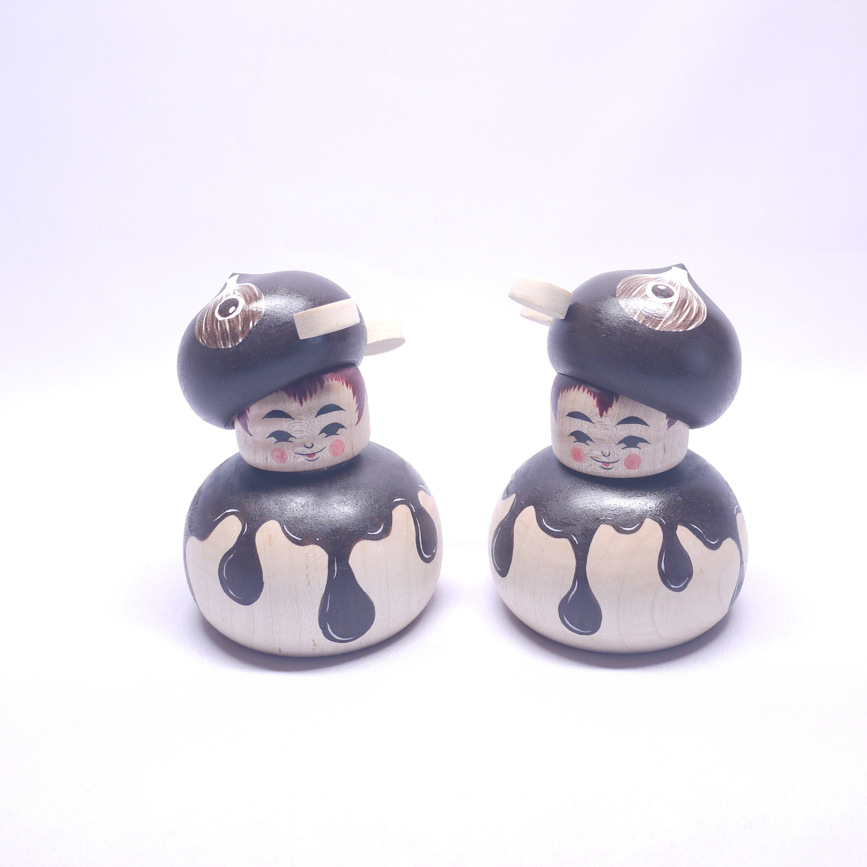 昭和生まれの洋菓子「たぬきケーキ」をモチーフにしたえじこ型の被り物系こけし。