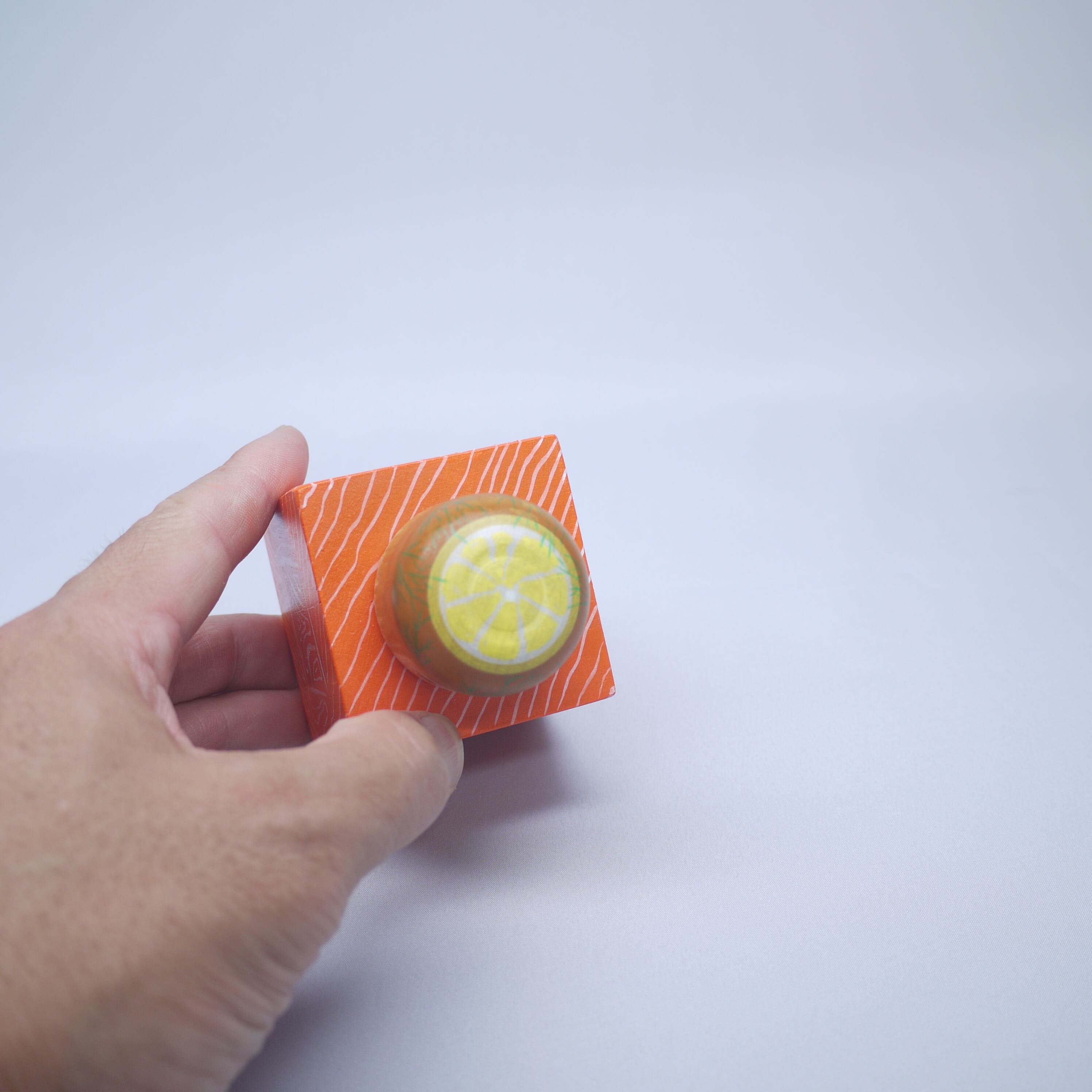 この立方体に鮭の切り身をあしらい、さらに、一から六の数字を書き込みサイコロのようなデザインを楽しめます。