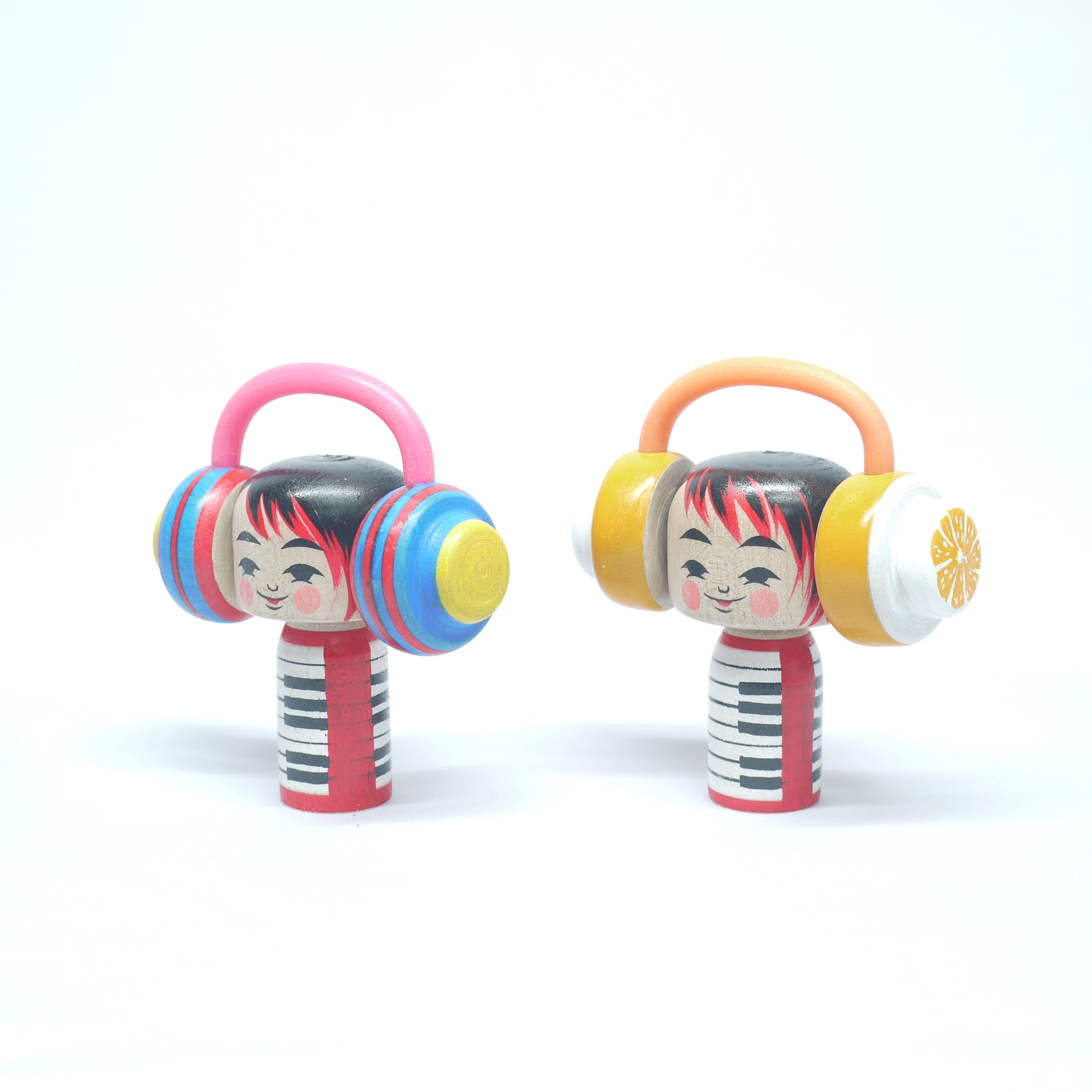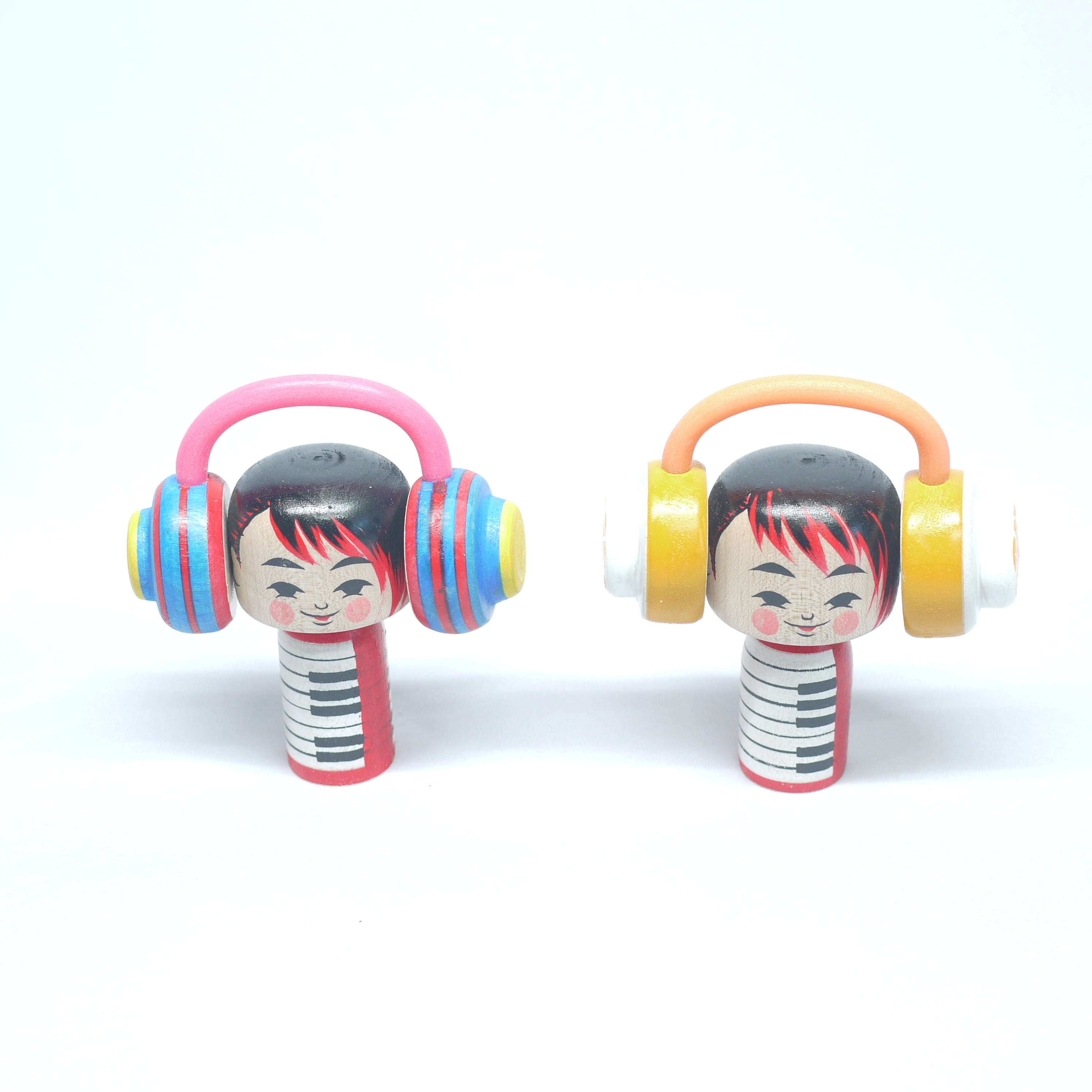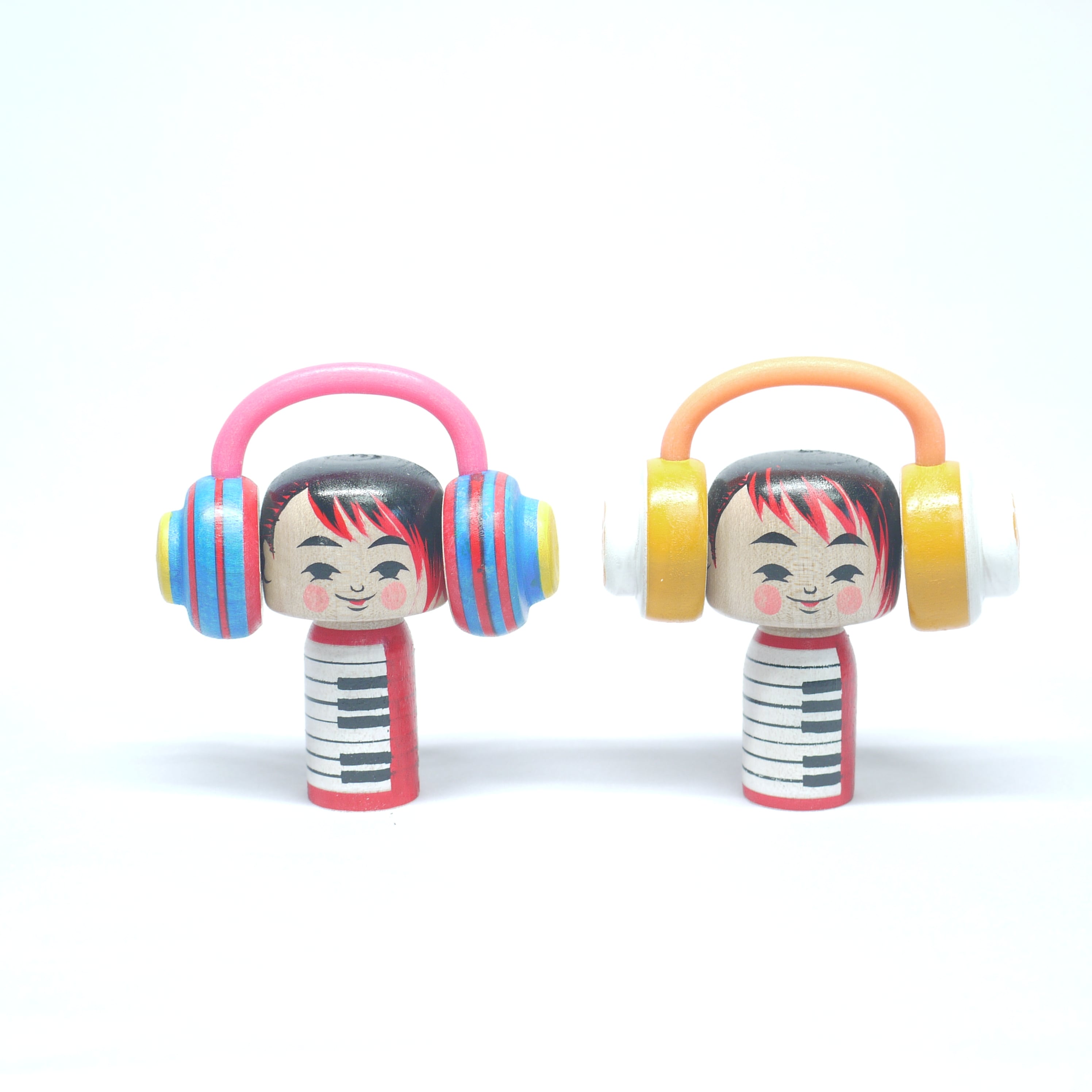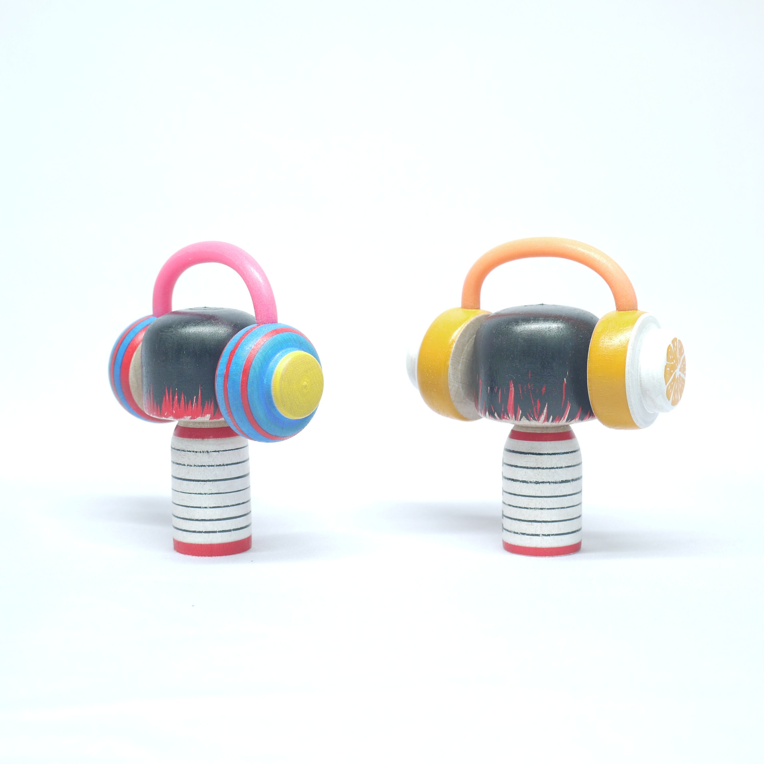 「音楽」と「ヘッドフォン」をテーマにしたこけし。