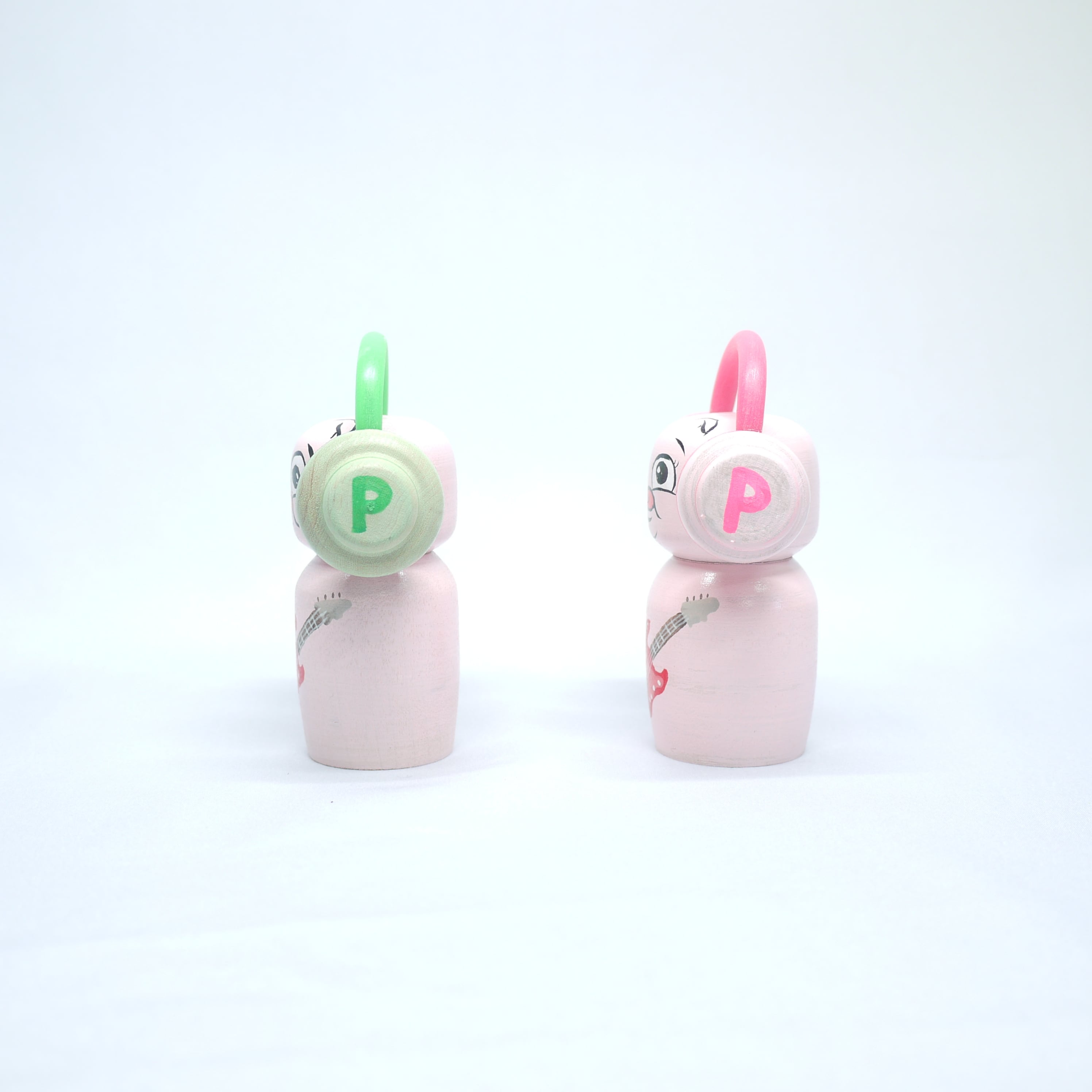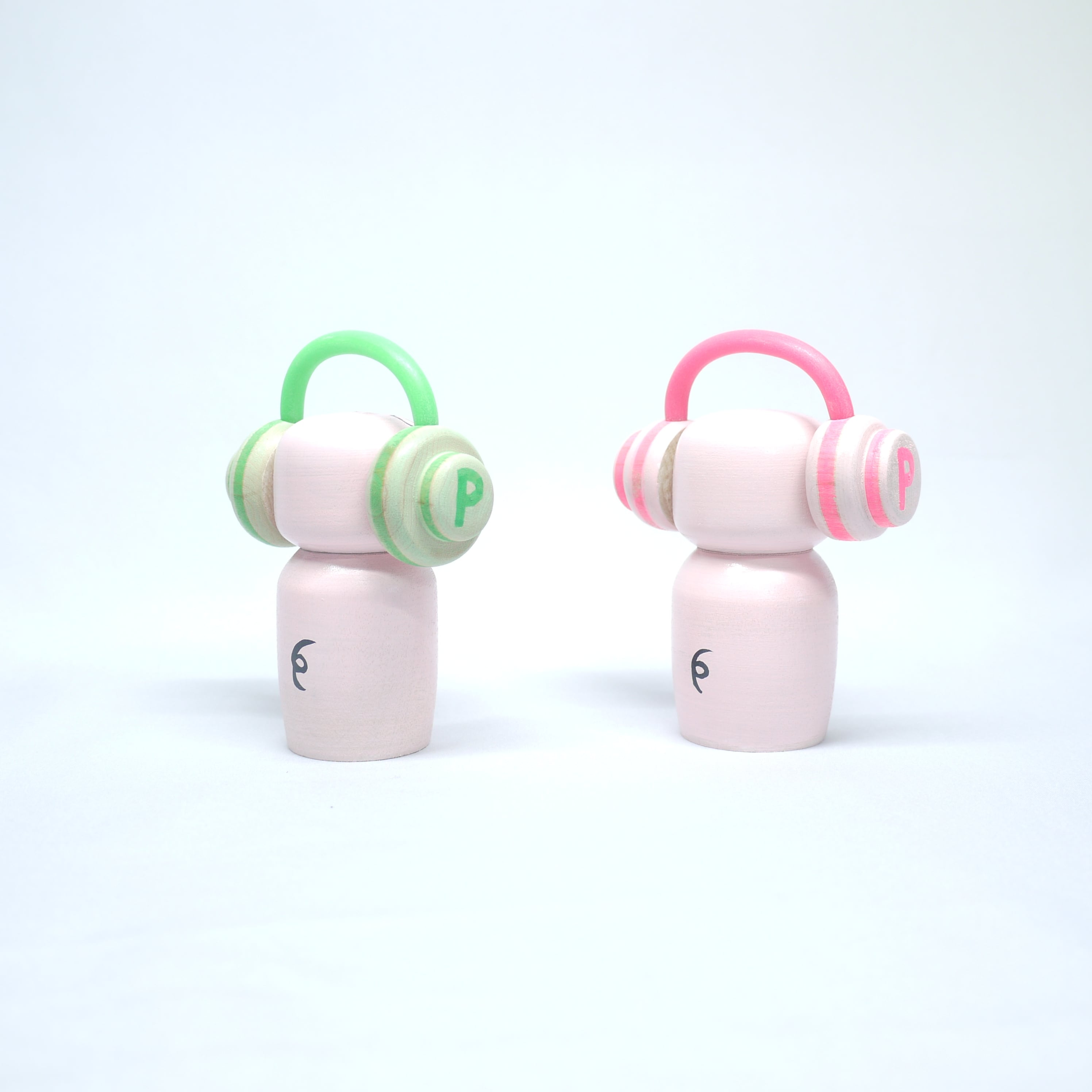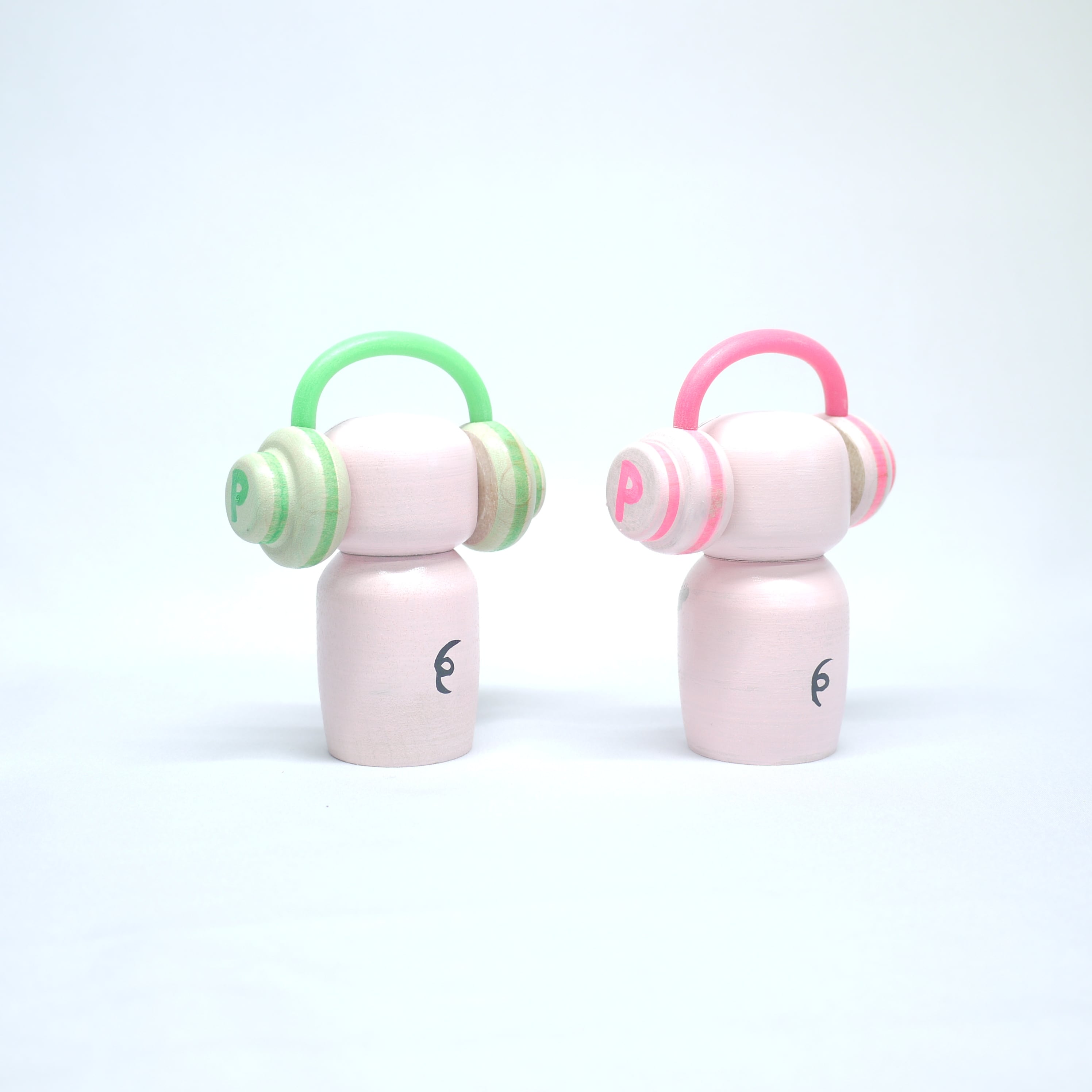 「音楽」と「ヘッドフォン」をテーマにしたこけし。