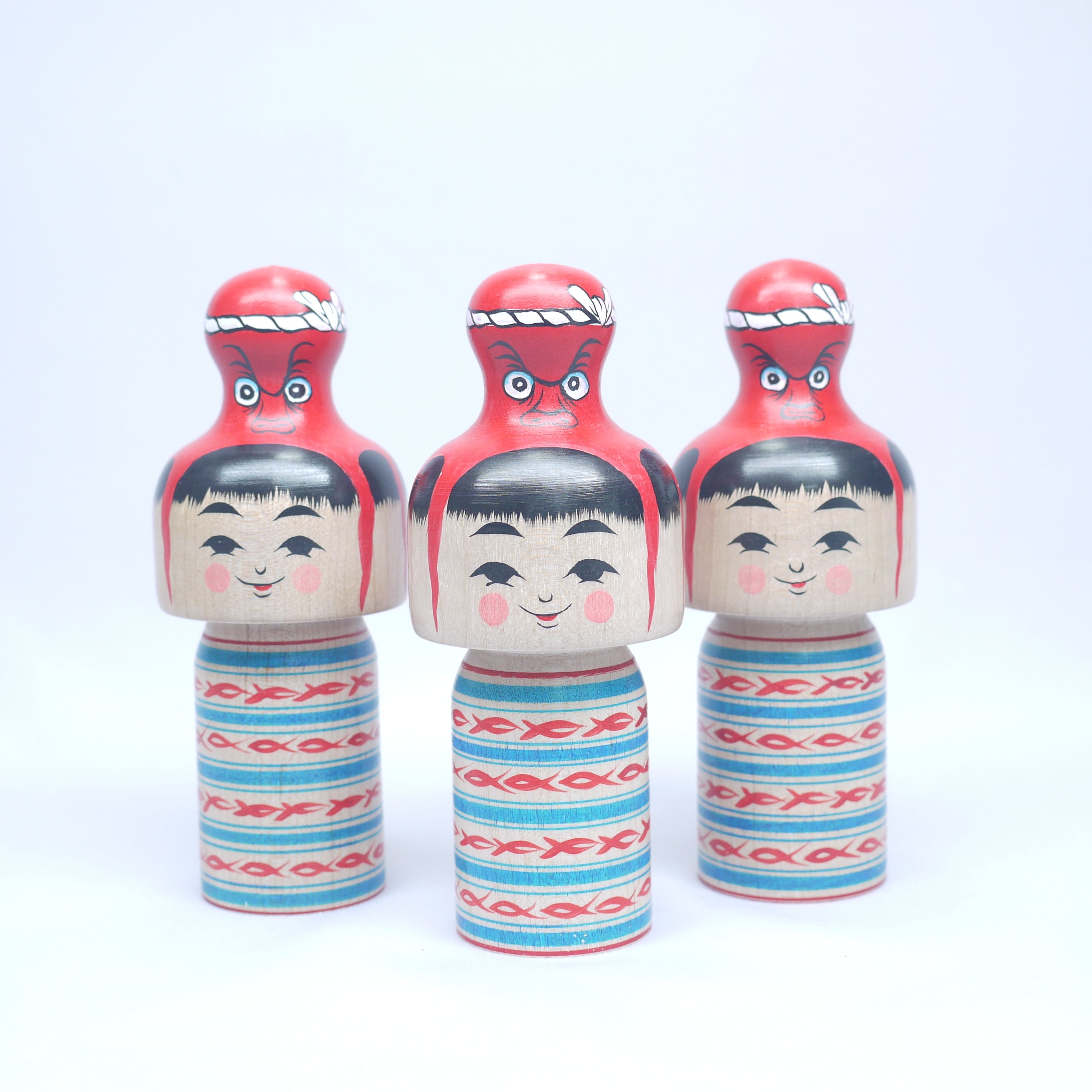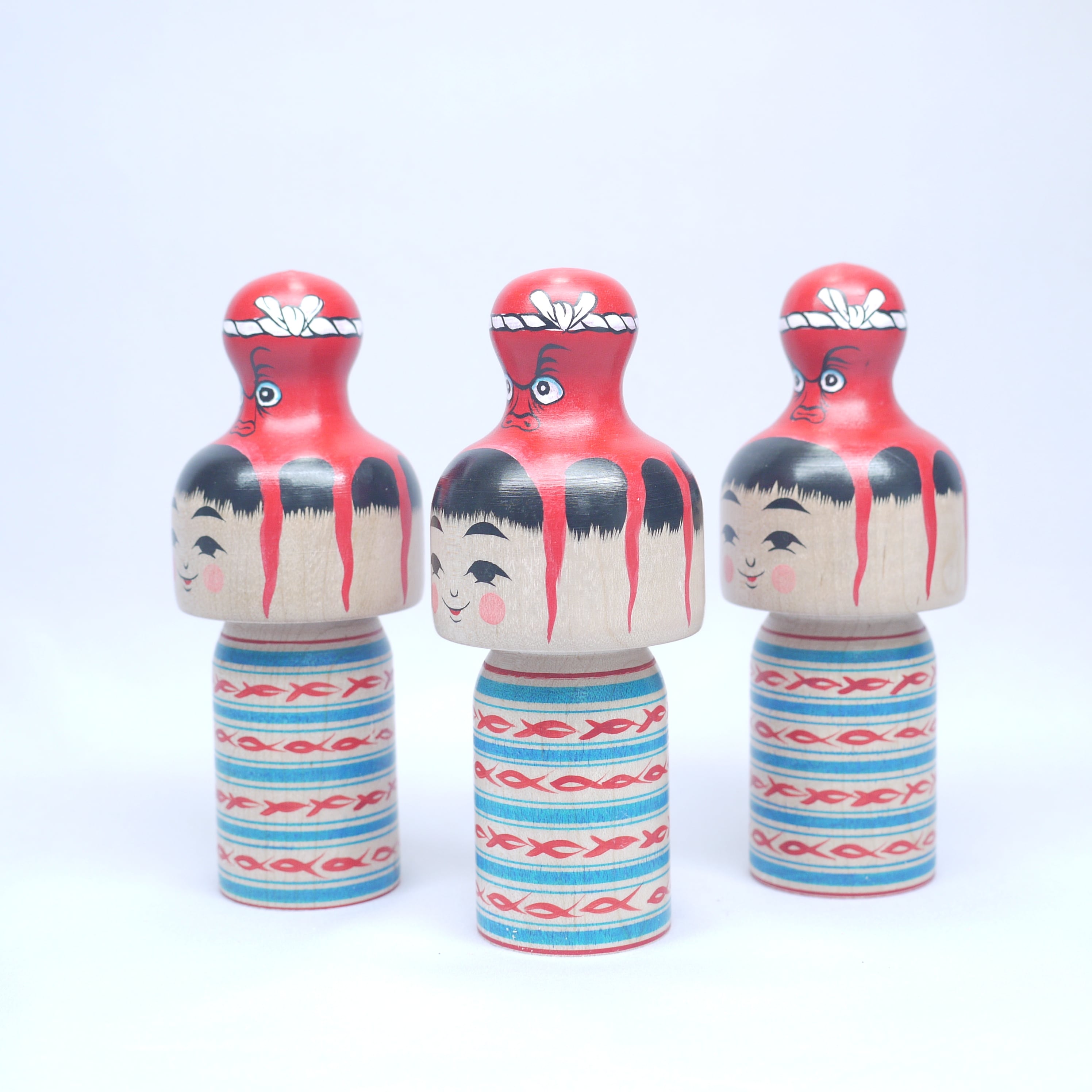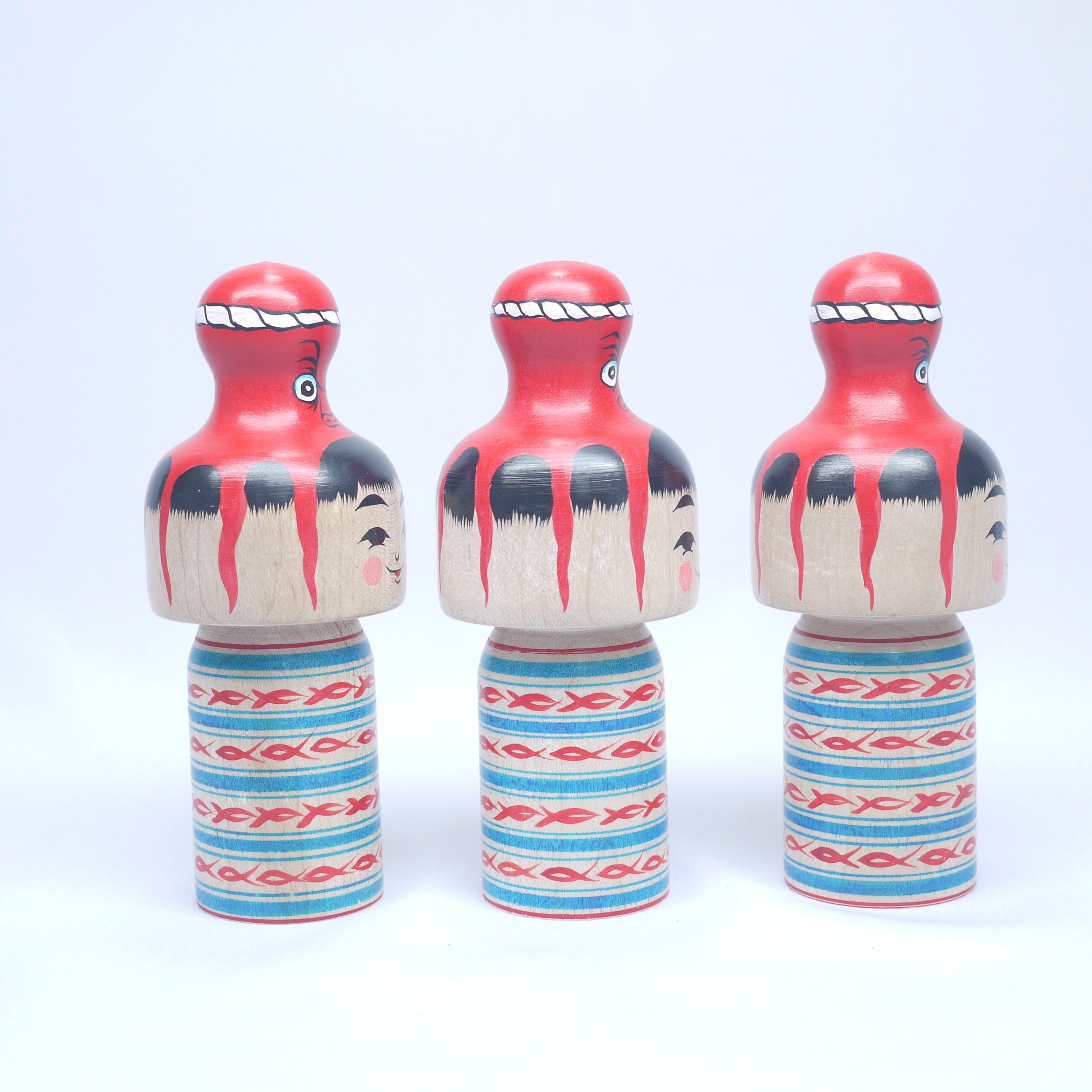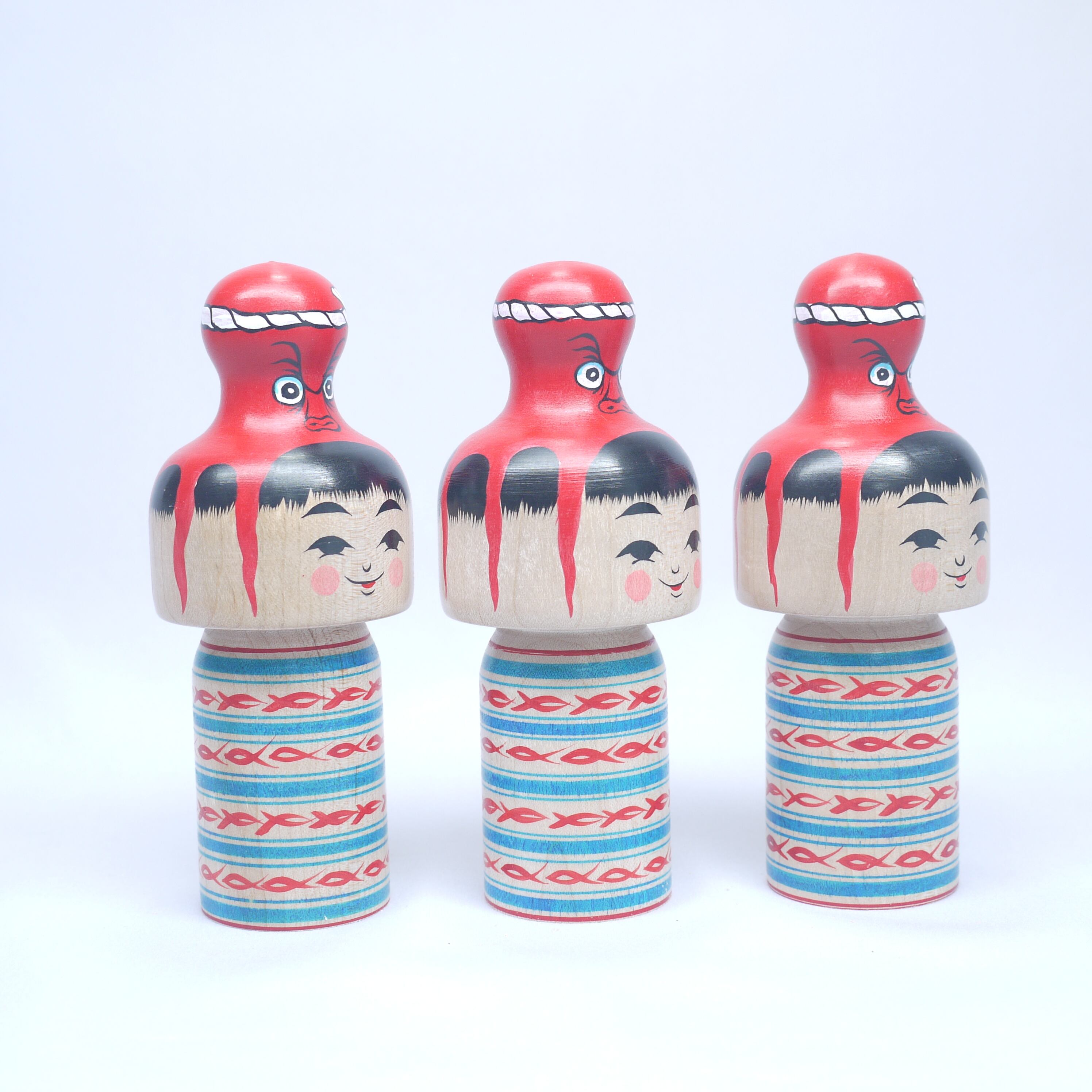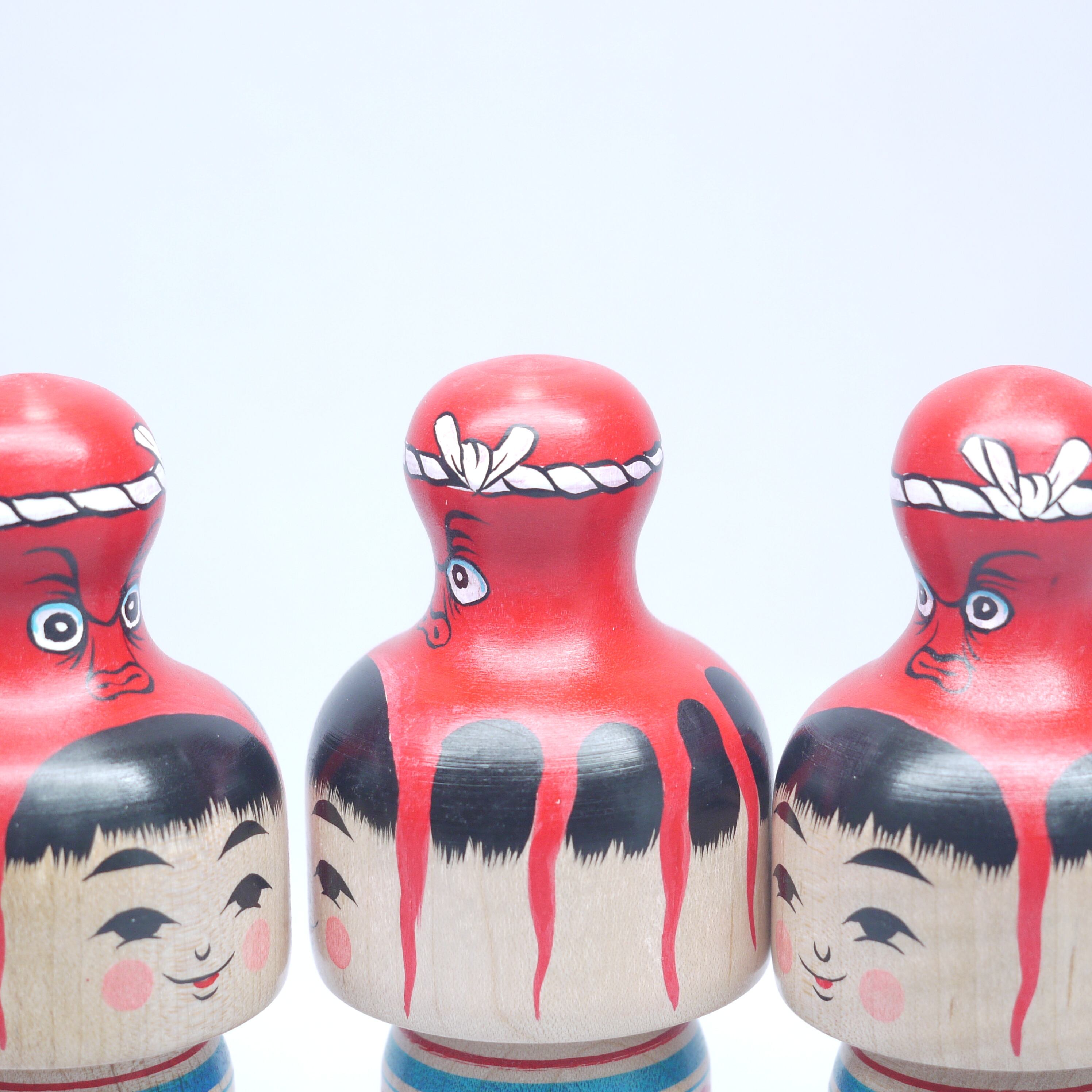 頭にタコを載せているこけし、頭にタコが乗っているこけし、タコに乗っかられたこけし、タコを肩車したこけし、、人によって見え方は様々。