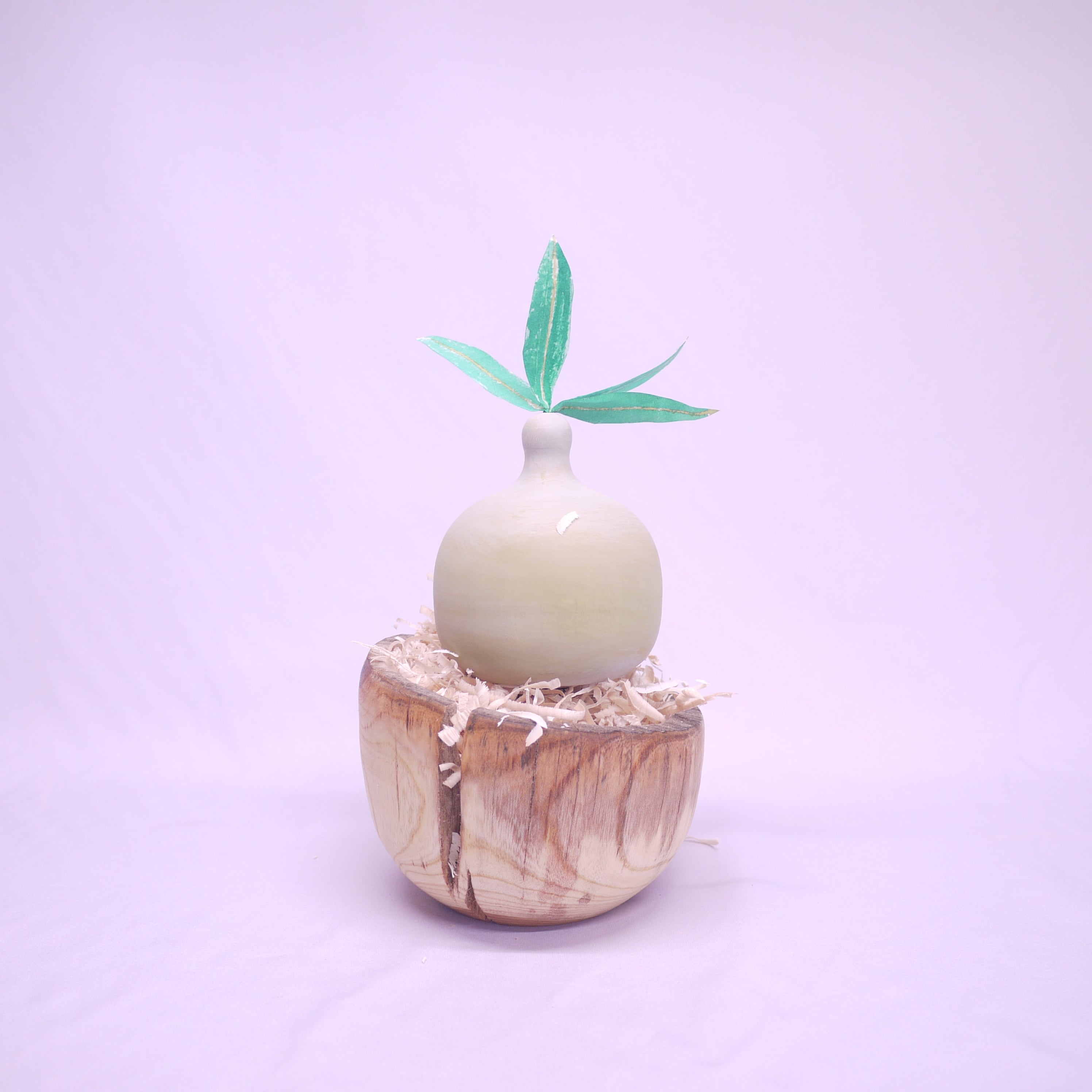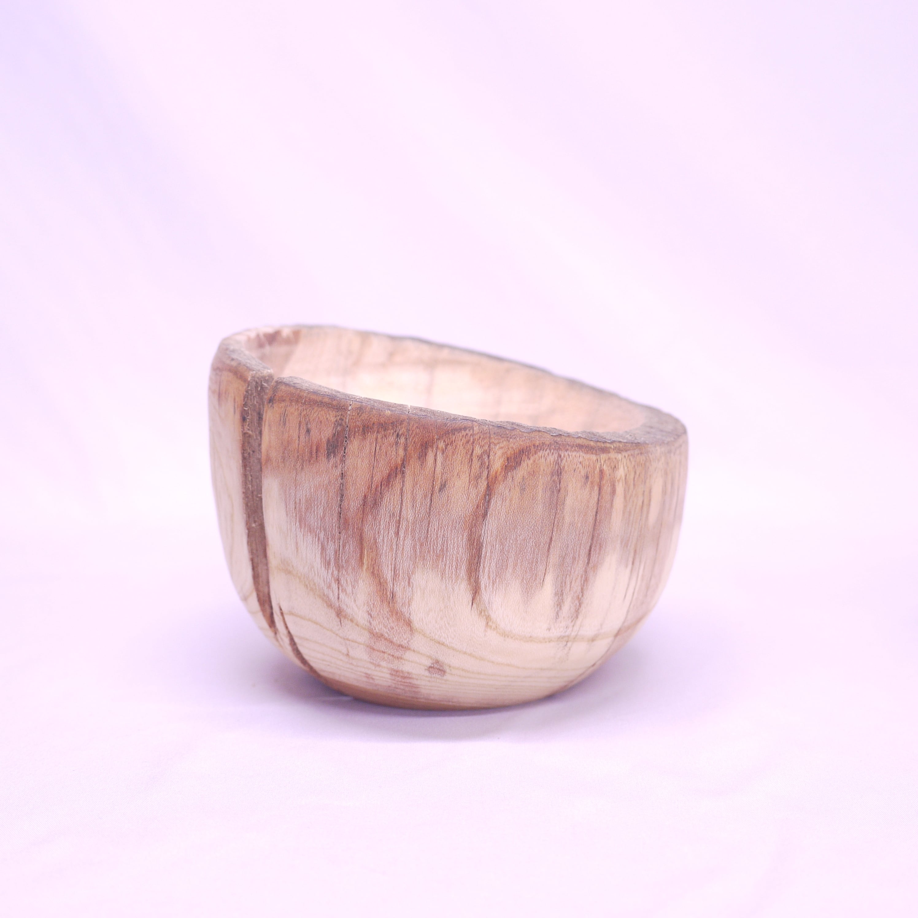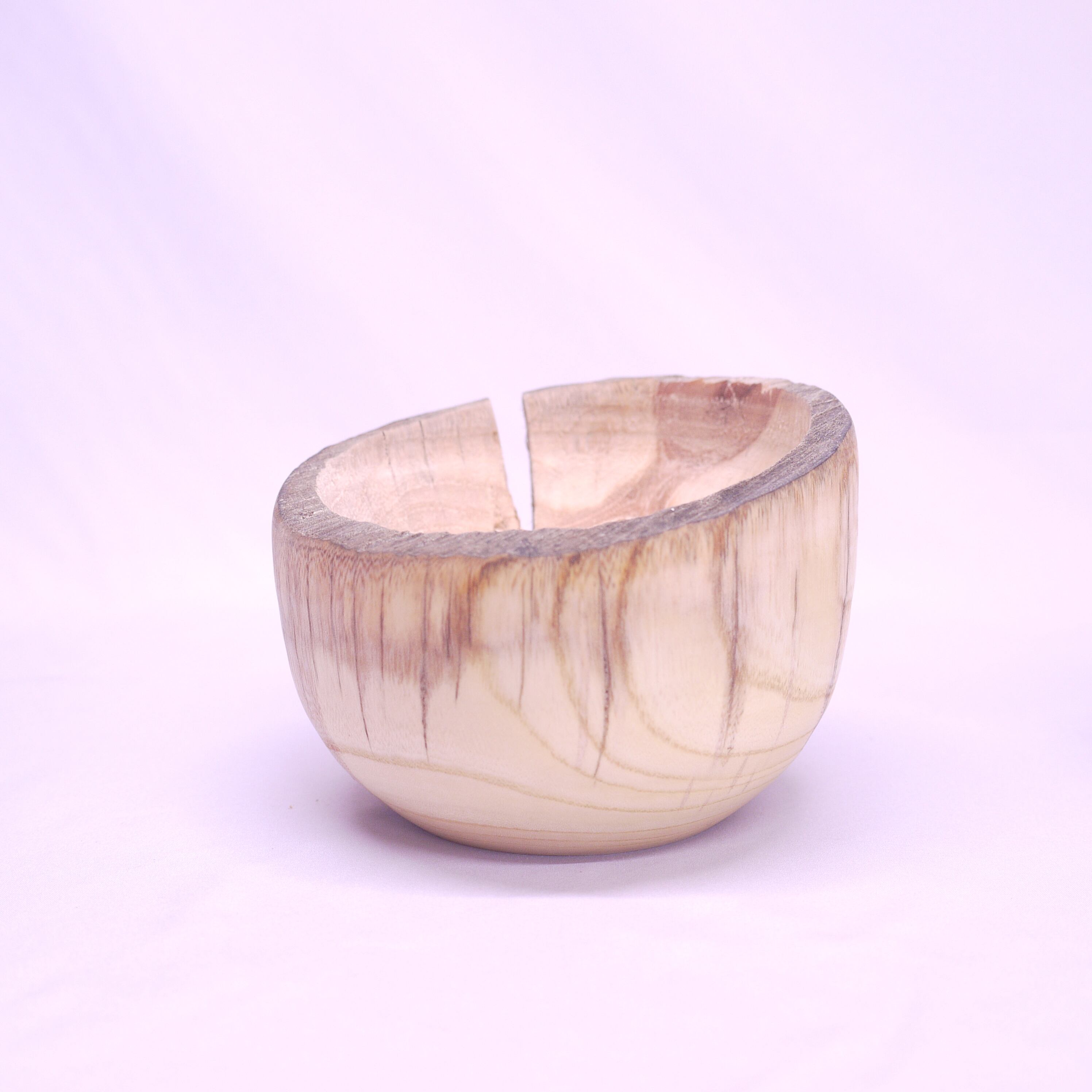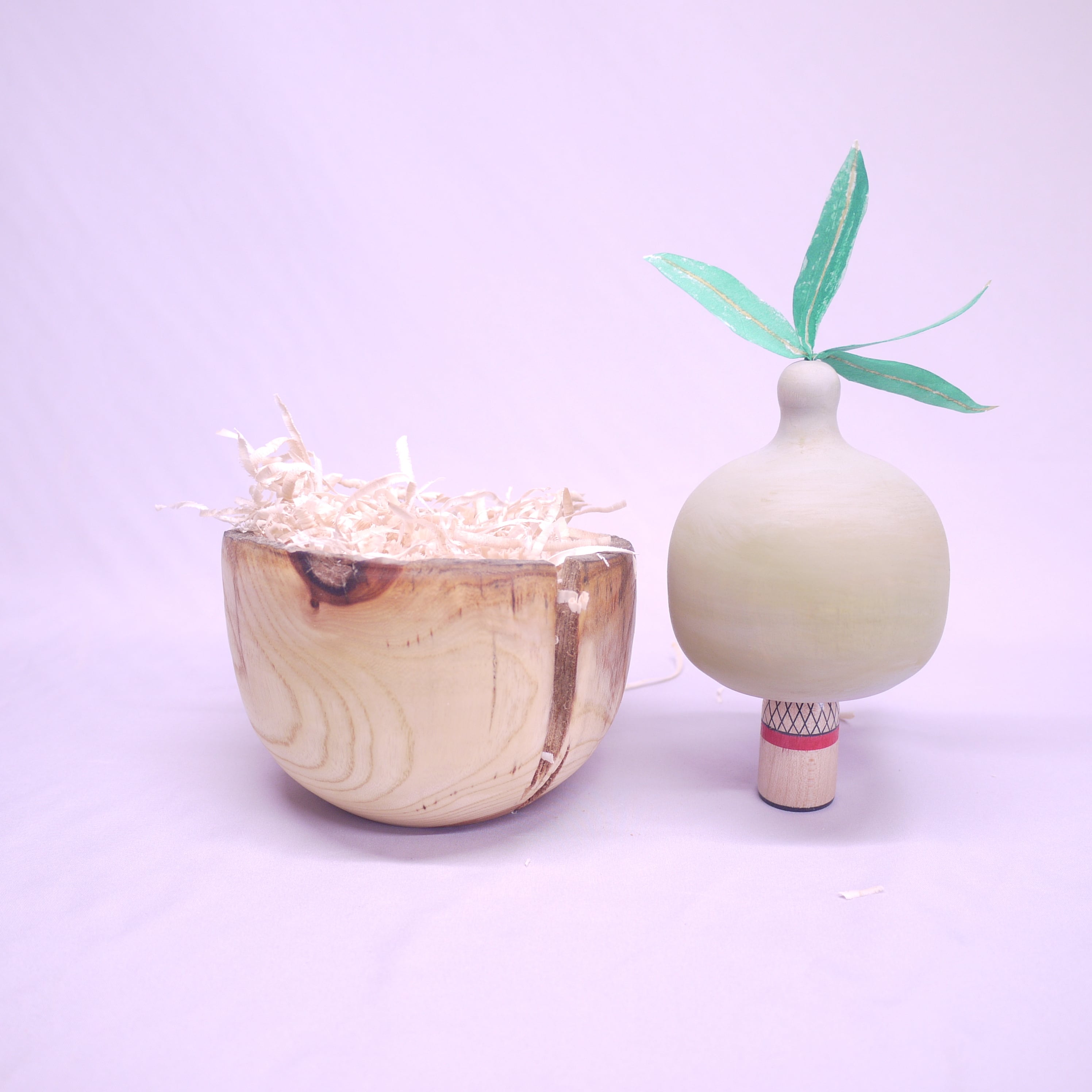 ・鉢はケヤキを使用しました。淵は加工せず、乾燥させた材のくすんだ表面をそのまま活かしています。大きな割れ、小さなヒビ、傾いた口、不完全でアシンメトリーではあるものの、異彩を放つ面白い鉢となっています。