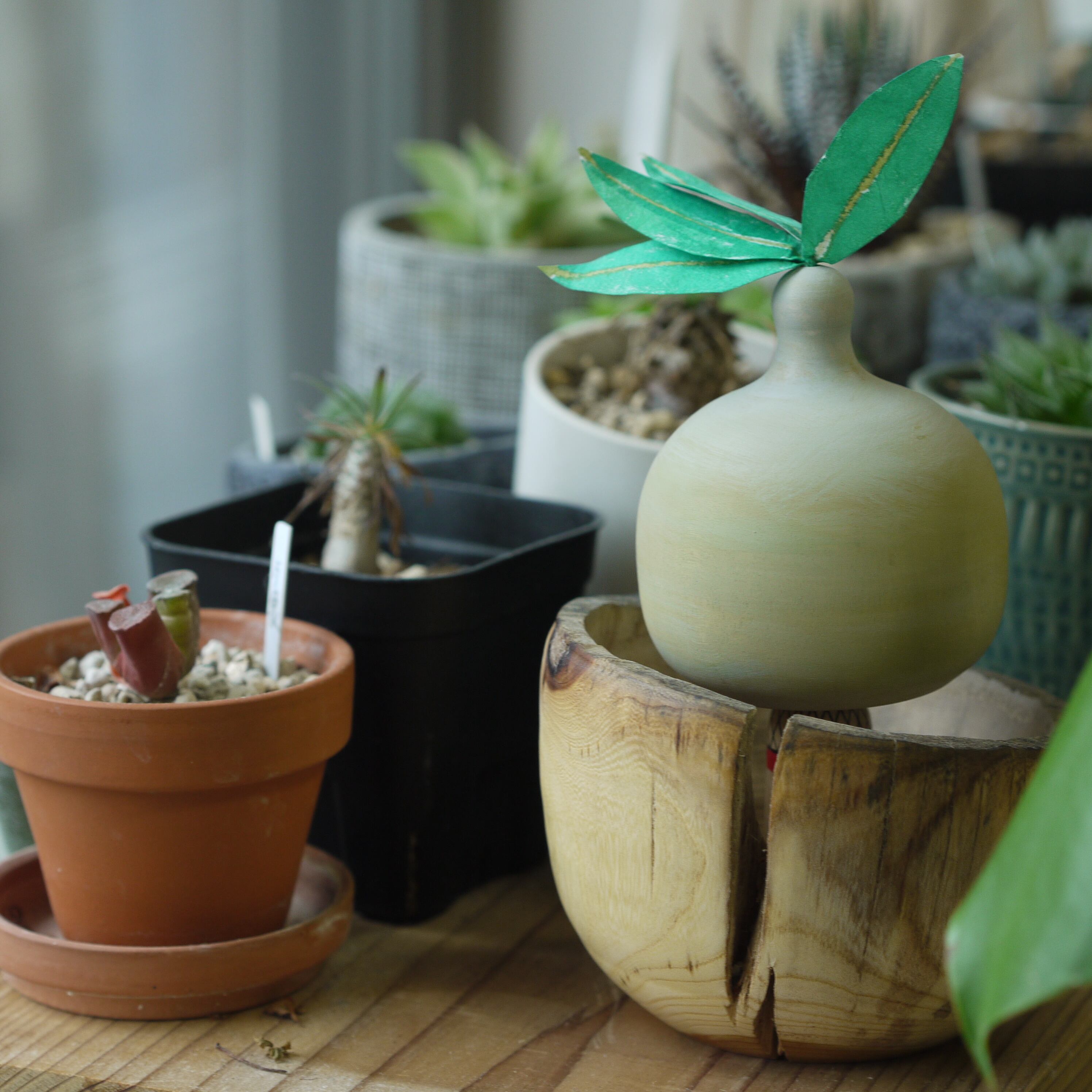 ・かぶりものは塊根植物の「パキポディウム・グラキリス」という実際にある種類をモチーフにしました。葉っぱの部分は丈夫な西の内和紙を差し込んであります。葉っぱは特に固定しておらず、簡単に引き抜けるようになっております。壊れたり紛失した場合はお好きな紙で自由に葉っぱを作ってみてください。