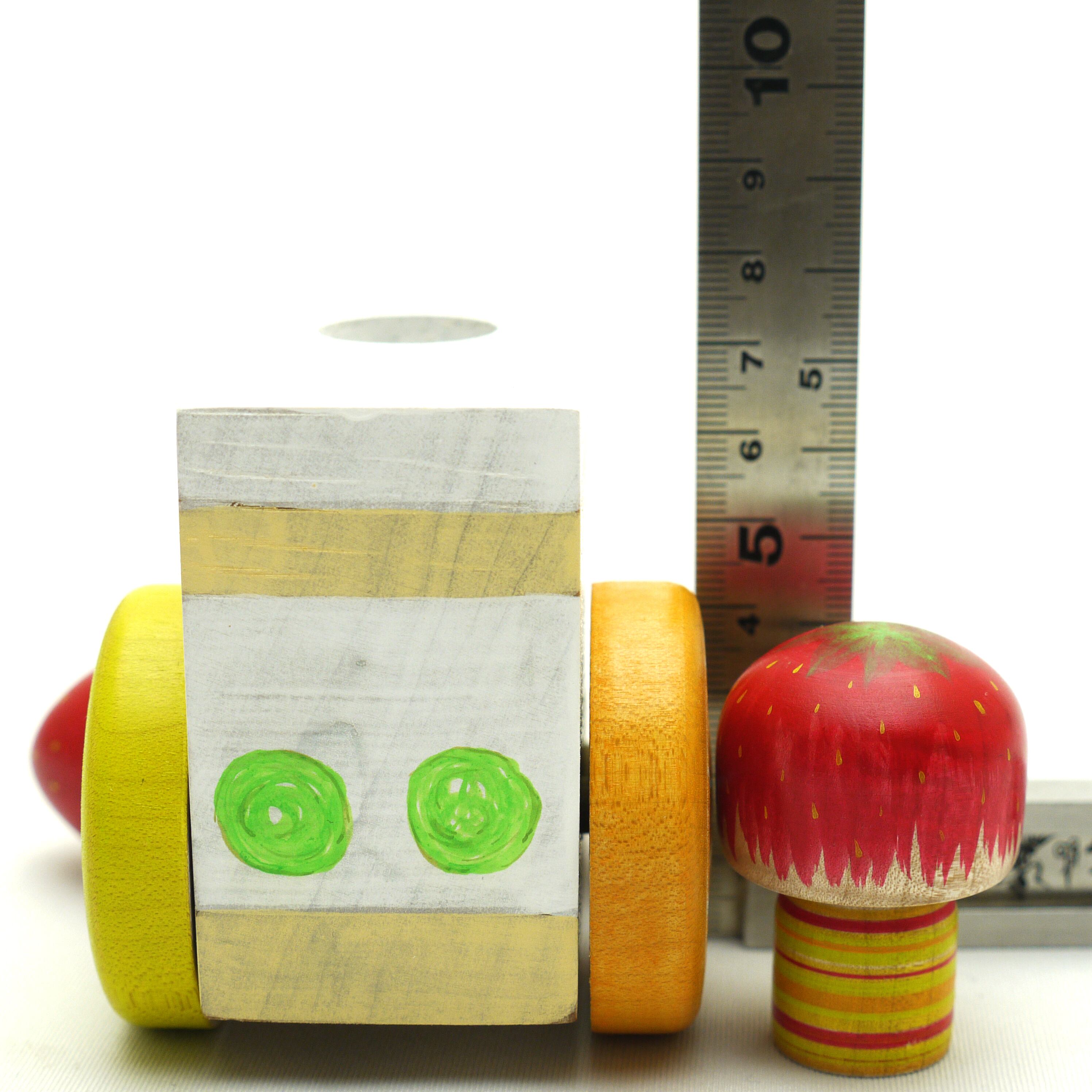 イチゴ、オレンジ、キウイフルーツ、パイナップル、マスカットのフルーツケーキを「えじこ」にして、フルーツのタイヤを装着した車の木地玩具。