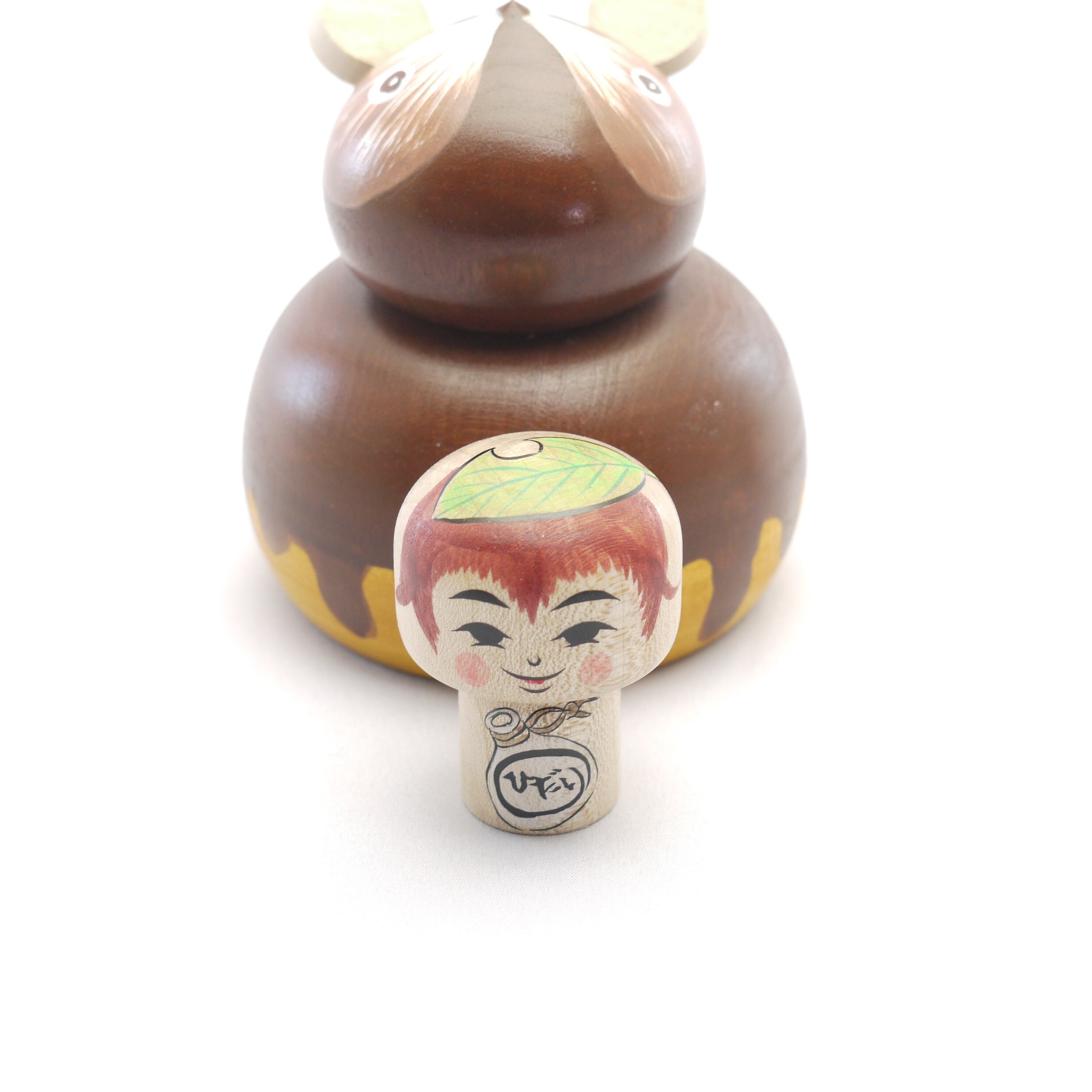 こけしは頭に葉っぱを載せて変化!胴には大好きな日本酒の徳利をあしらいました。