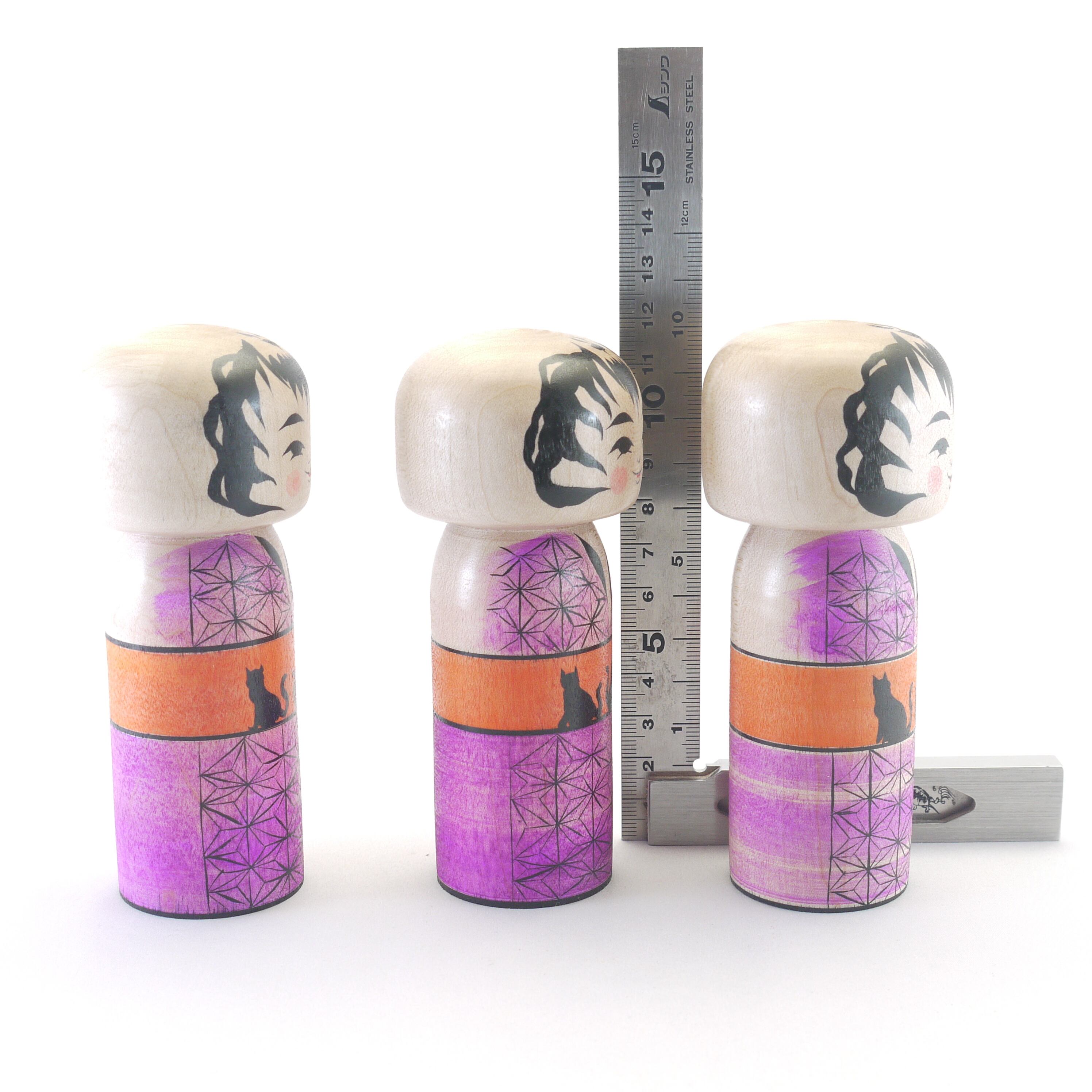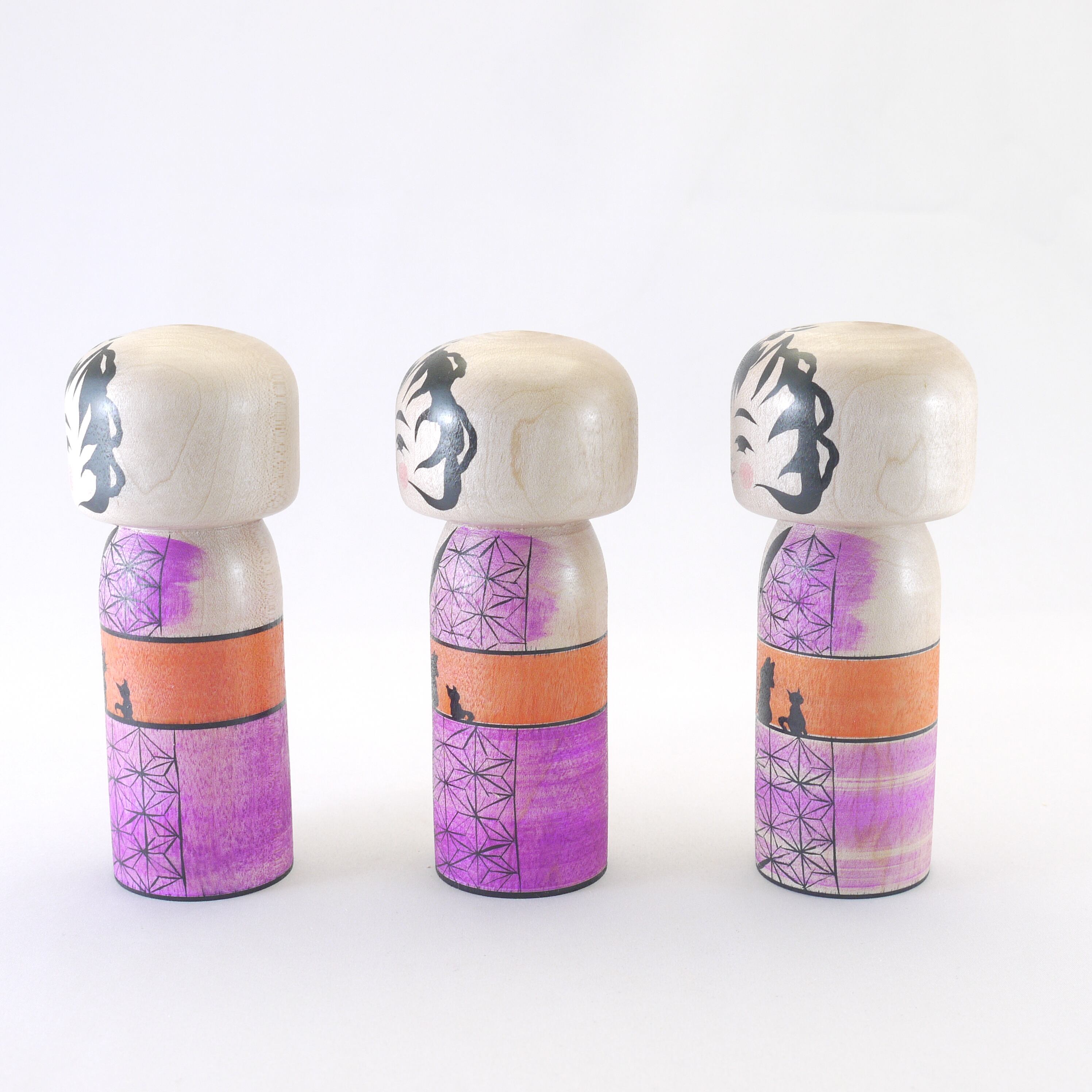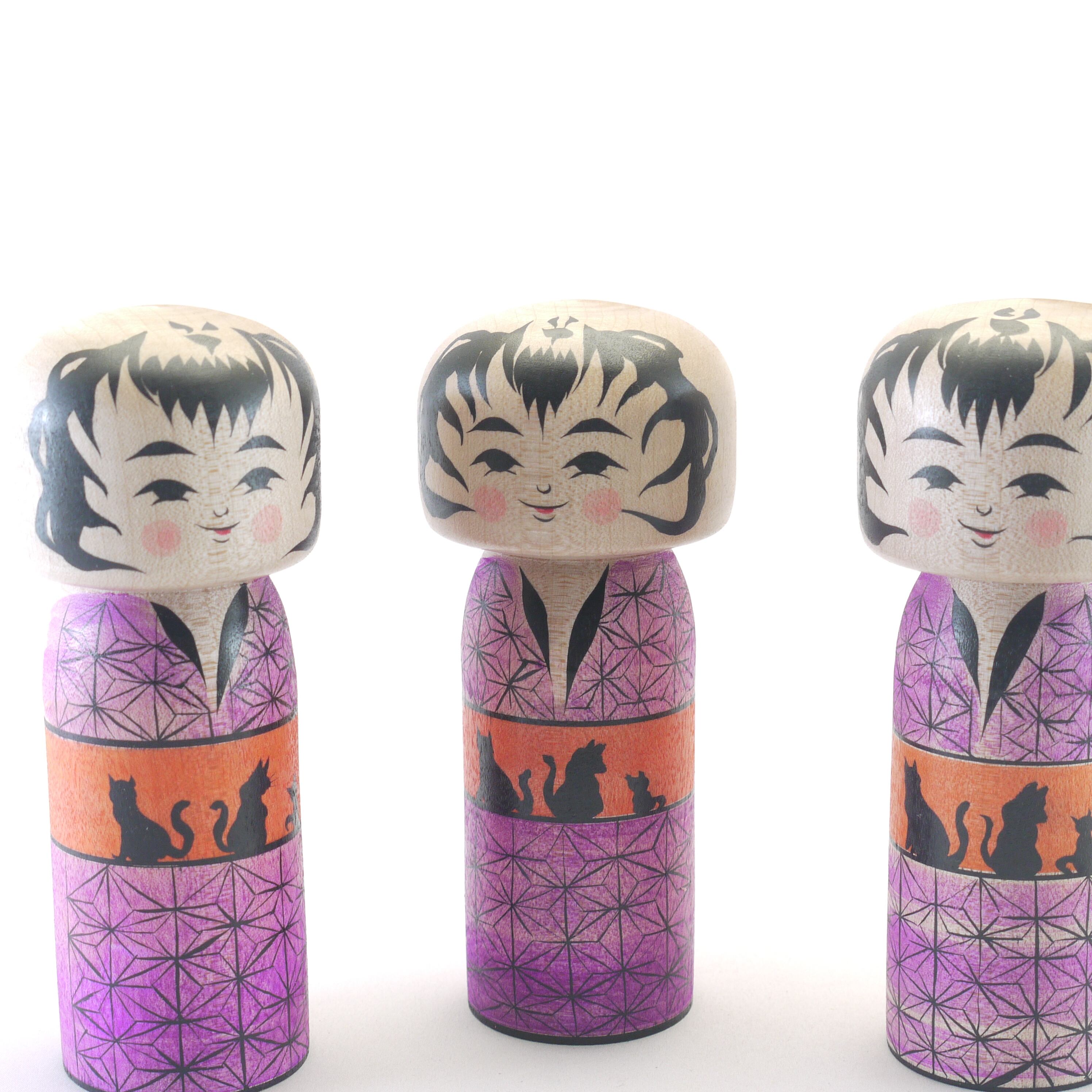着物は「麻の葉」柄、帯は3匹の猫柄