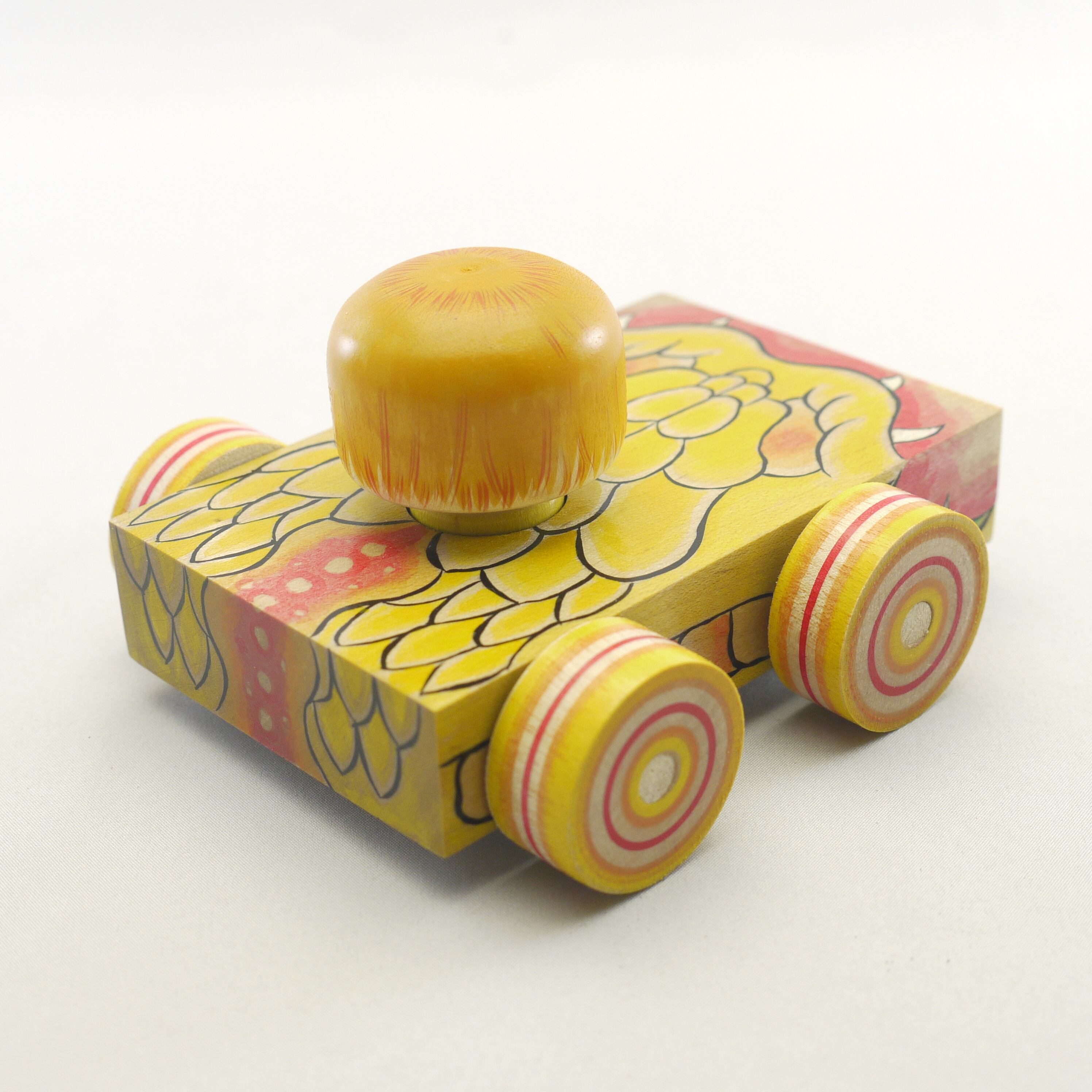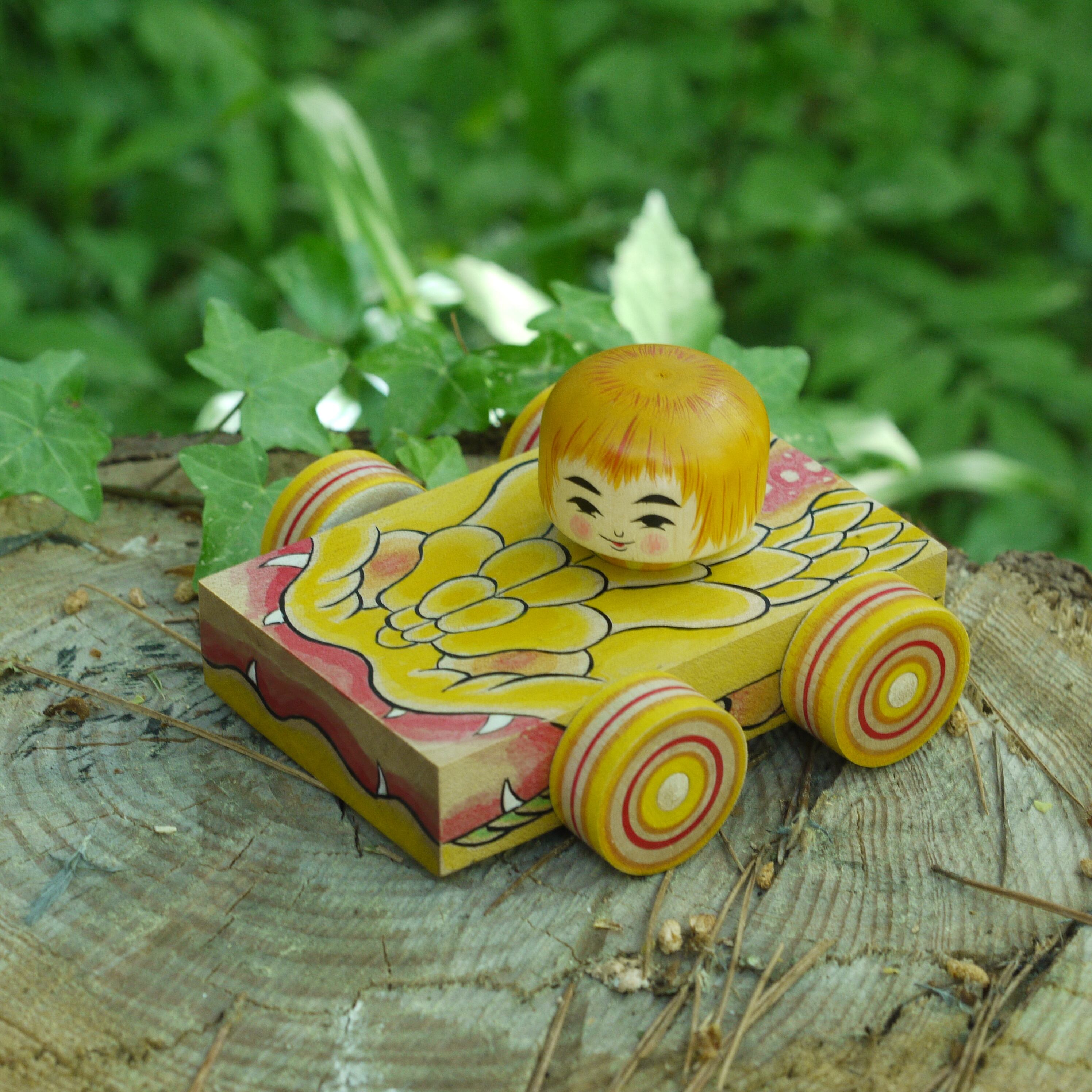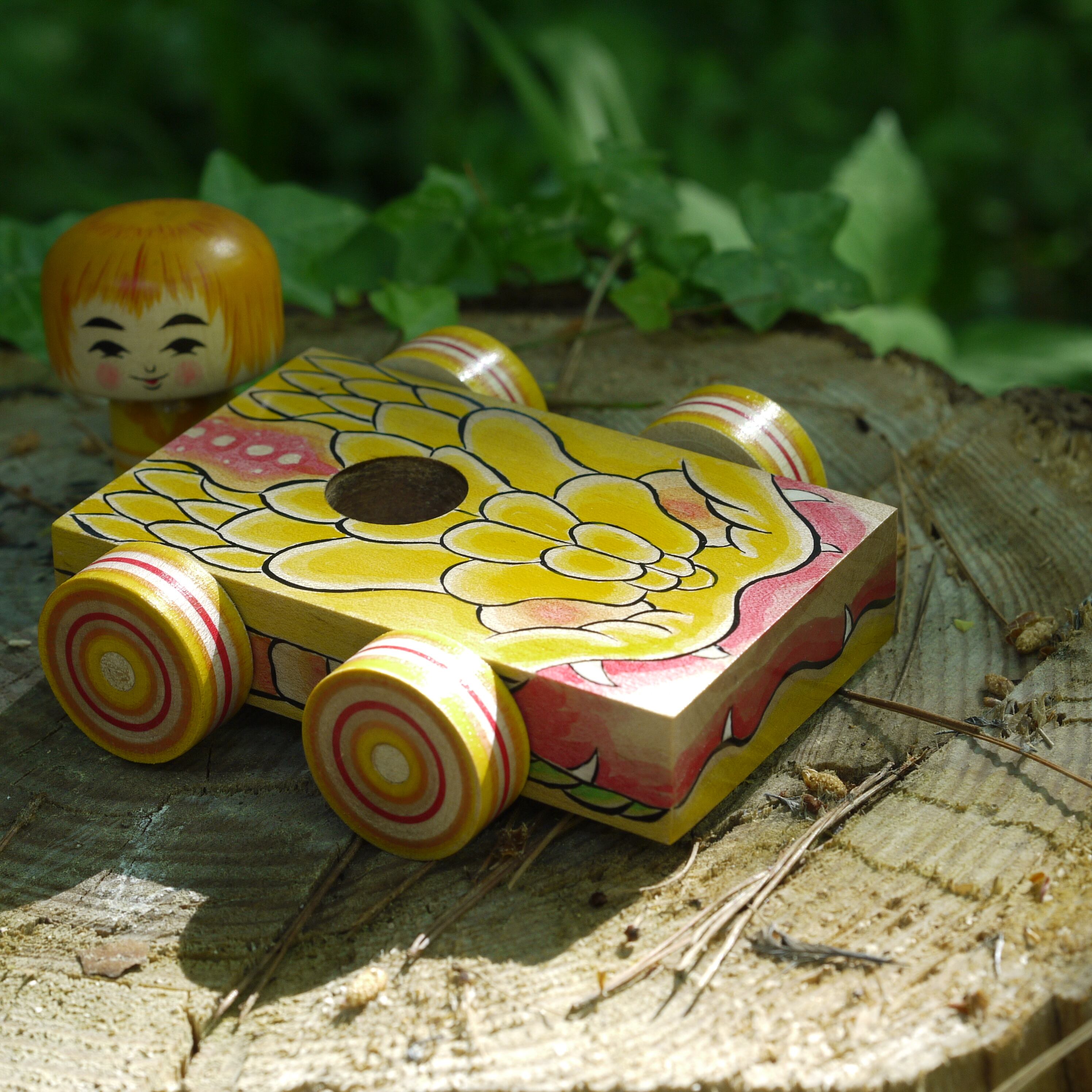 クワッ!と口を開いた蛇のような車の現代木地玩具。