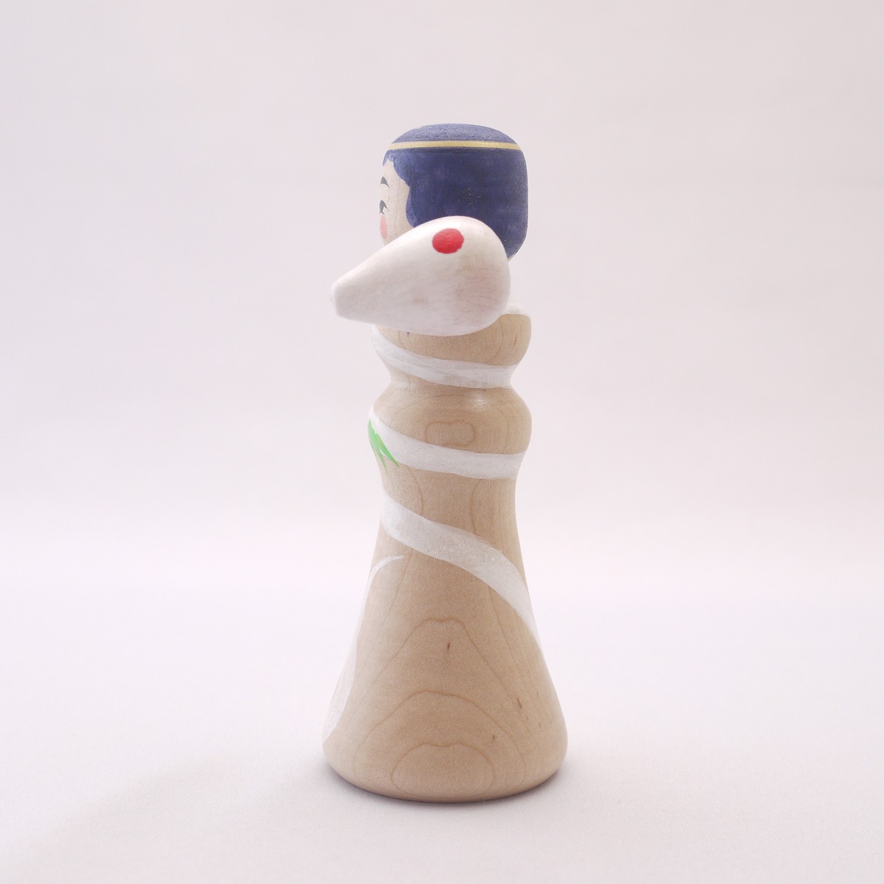 弁財天様、宇賀神様をイメージした天女が白い大蛇を巻き抱(いだ)き、肩から顔を覗かせている様子をこけしに落とし込みました。